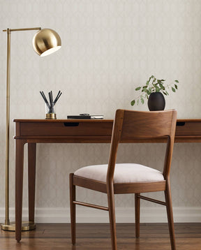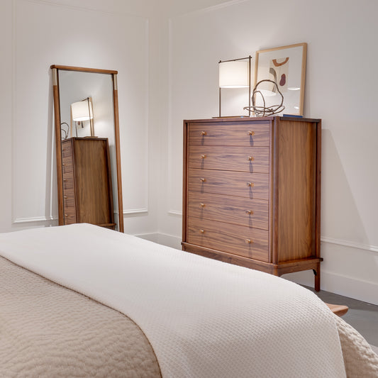Hardware includes walnut knobs on turned metal bases and soft brass ferrules on the Upholstered Bed and Floor Mirror.