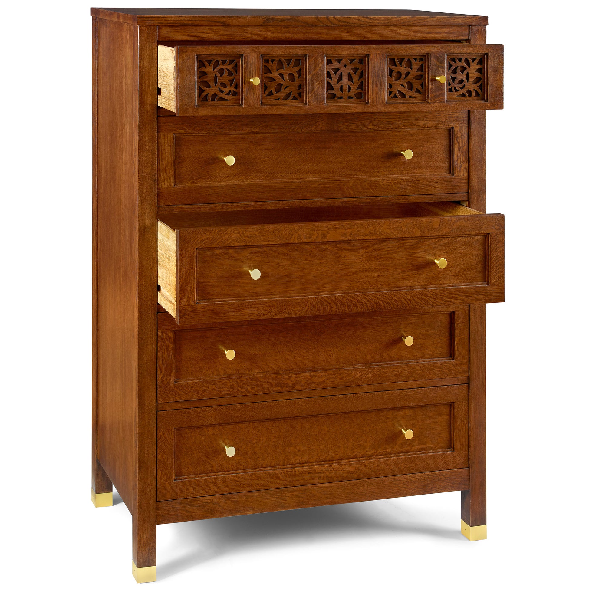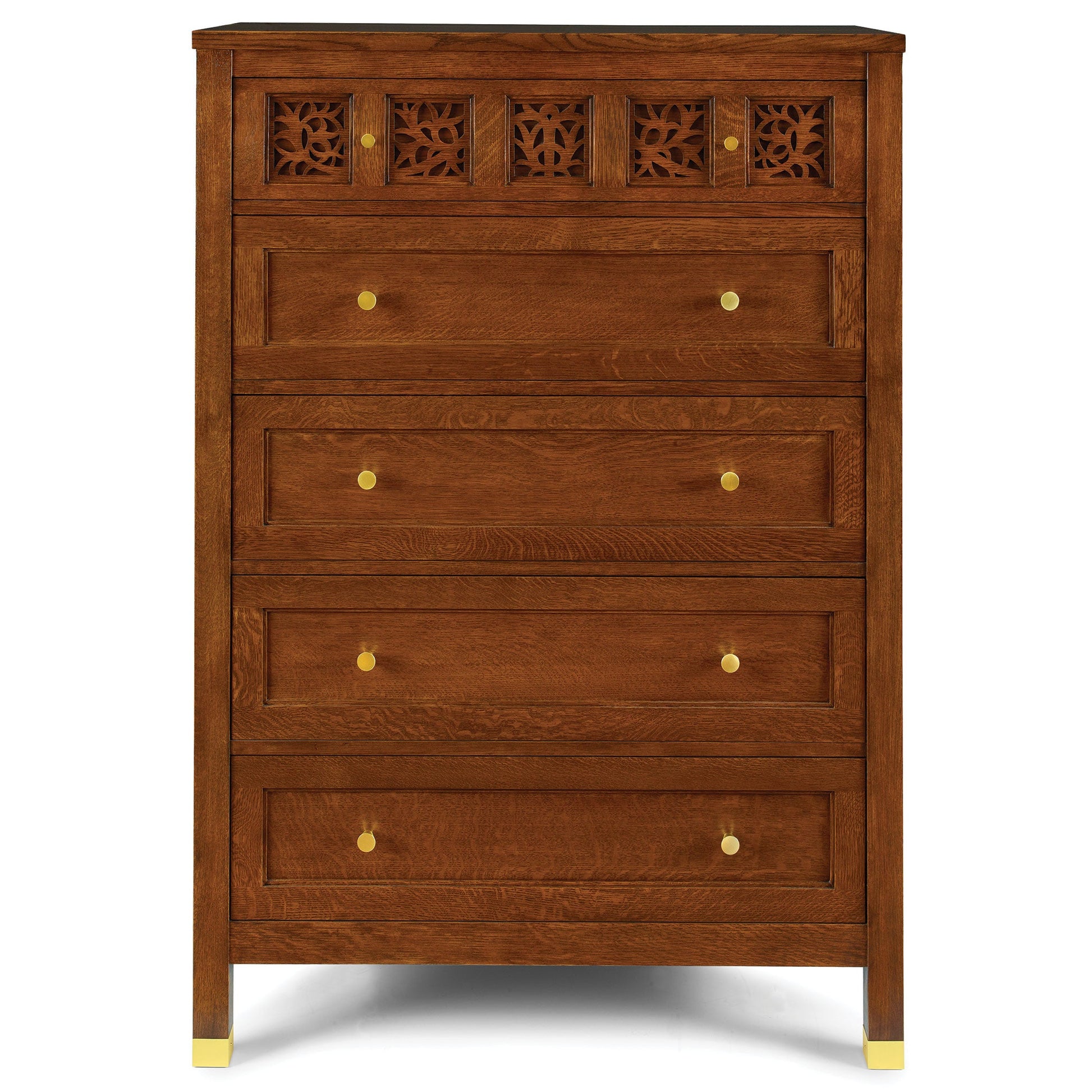 Our dressers and chests are beautiful examples of Surrey Hills' artisan qualities. The Tall Chest's case of quartersawn white oak holds five side-hung, center-guided drawers with tapered satin brass knobs in two sizes. The top drawer features our fretwork motif with a back panel and a continuous vine pattern cut from square to square. Stepped stiles around each square and drawer face add definition and depth, and the legs end in low satin brass ferrules.