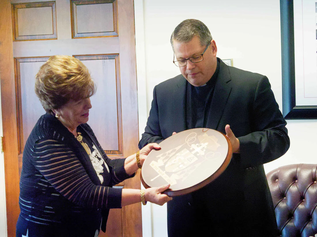 “On behalf of everyone at Stickley, I am very excited to present the coat of arms to the new bishop. It was wonderful to be involved in the creation of such an exquisite piece,” said Mrs. Aminy I. Audi, Stickley CEO and Chairman of the Board.The coat of arms was presented as a gift from the Audi family and Stickley. Mrs. Audi and Mr. Edward Audi, President, presented the coat of arms during a special August 1 visit to Stickley by Bishop Lucia and representatives of the diocese. Following the presentation, Bishop Lucia enjoyed a tour of the factory. The tour concluded with a visit to the cafeteria where flags representing the thirty-eight nations of Stickley craftspeople are proudly displayed. To view project photos, click here.
