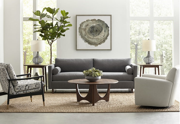 In the living room, focus on creating a comfortable and inviting space. For seating, choose a mid-century modern sofa such as our Morgan Sofa and pair it with accent and lounge chairs that have organic shapes.