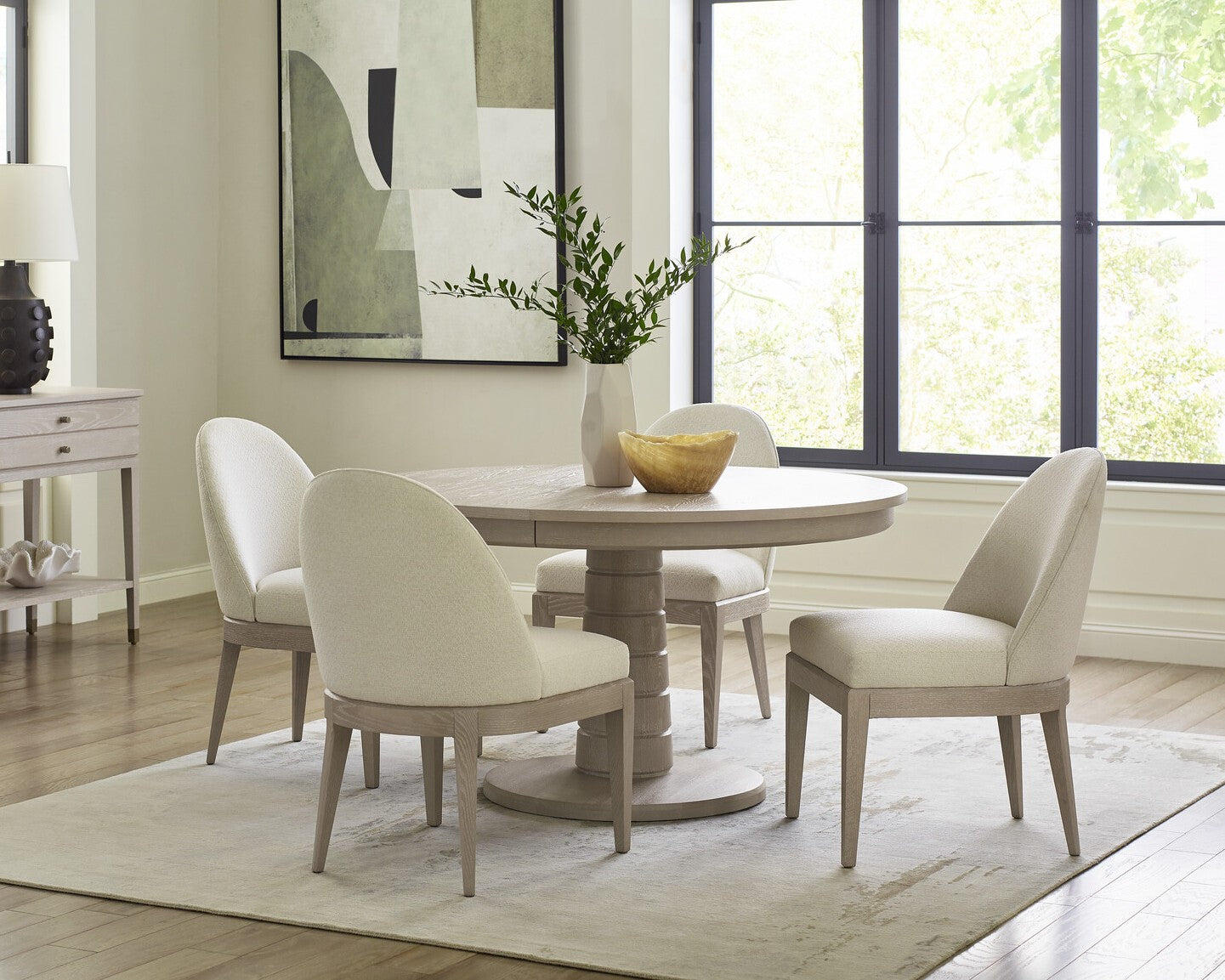 Blending rustic warmth with refined simplicity, this round dining set