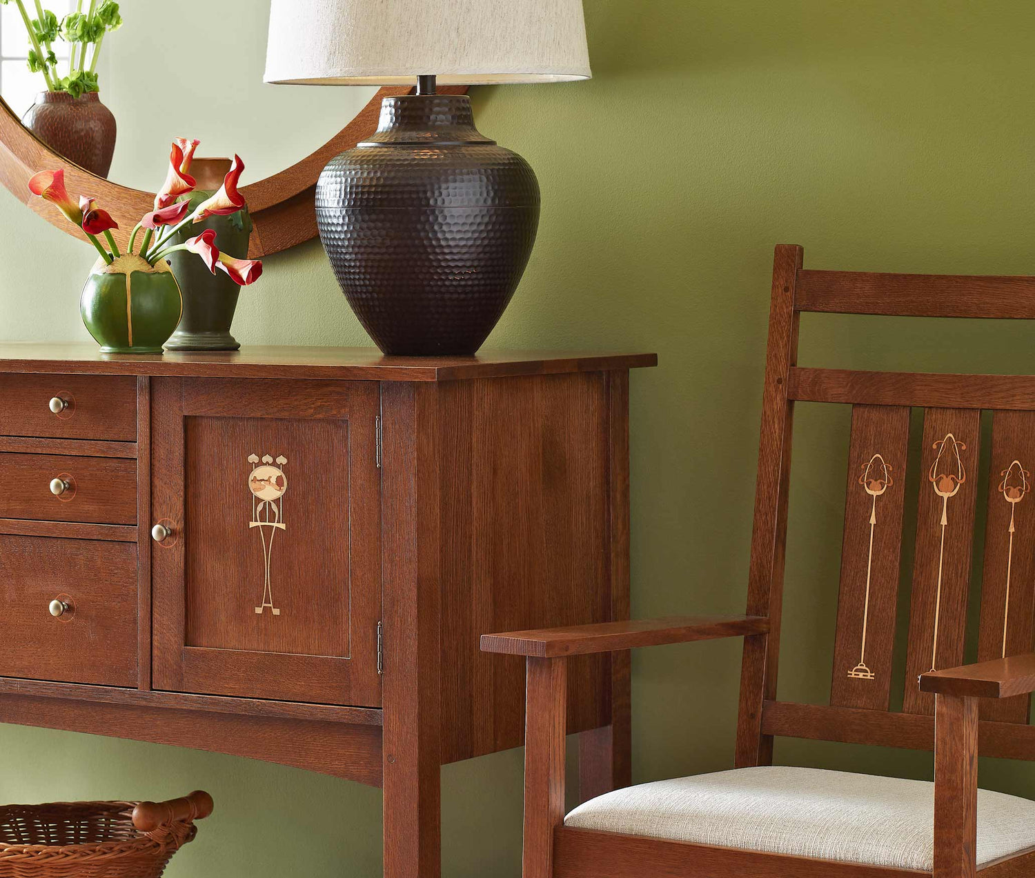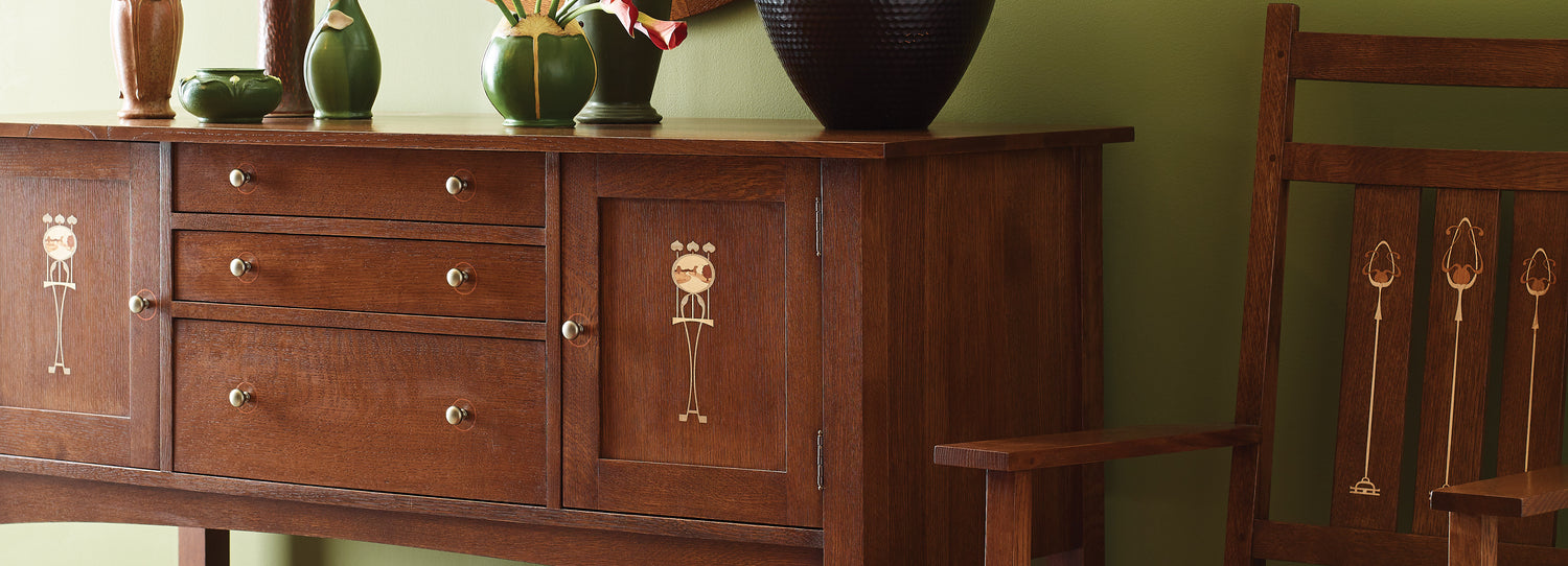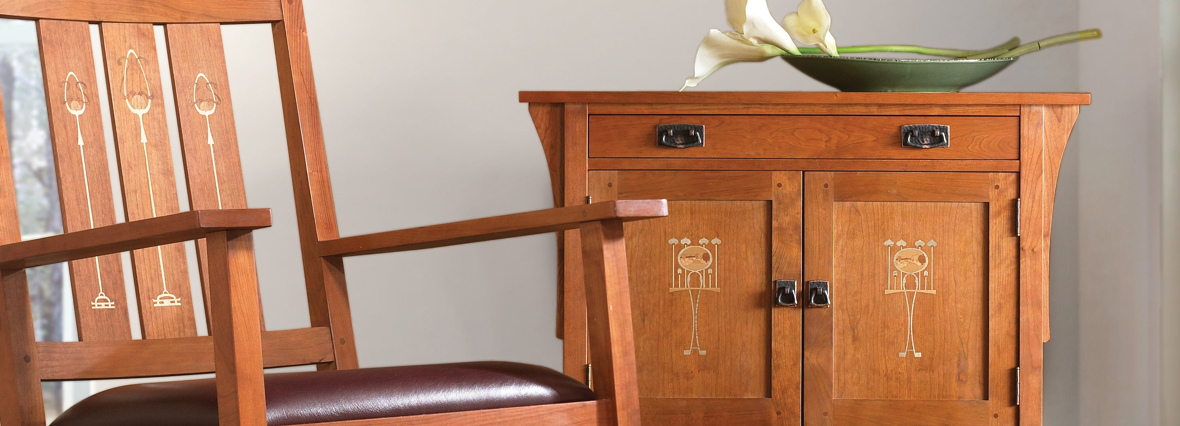 Harvey Ellis inlay patterns—including elongated floral abstracts, sailing ships, and woodland scenes—add beautiful decorative detail. Our modern interpretations are composed primarily of colorful woods like cherry, makore, English sycamore, magnolia, and bird’s-eye maple, with occasional copper rings and accents.