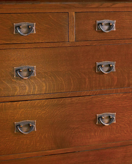 Harvey Ellis oak drawer fronts are paired with dark copper bail pulls in a classic Mission style.
