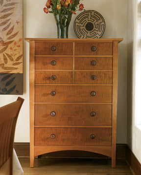 • Close-up of a Harvey Ellis High Double Dresser with a curly maple front