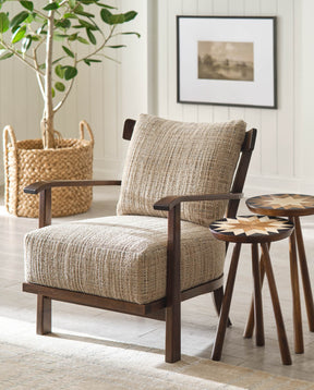 Upholstered seating from Hudson Valley—including a shapely settee, refreshed wing chair, and a novel wood-frame chair with classic spindles and an extra-thick seat—translates traditional forms with a modern scale and tailoring.
