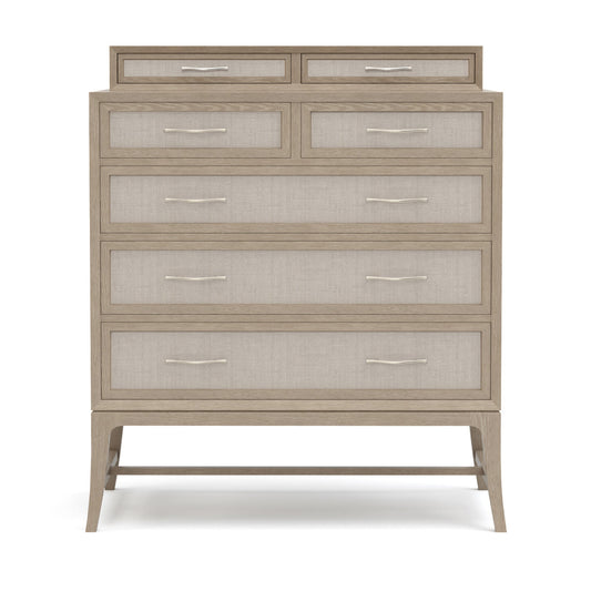 Standing on tall saber legs, the Maidstone Tall Chest with Gallery is an unquestionable beauty, shown here in our cerused Pier finish with optional Woven Jute accents. Additional drawers in the top gallery include velvet liners and a jewelry tray.