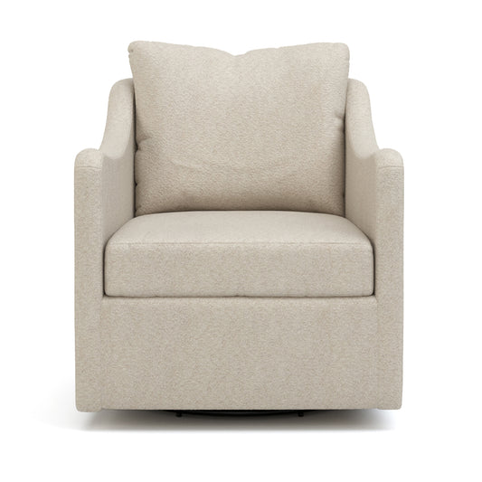 • Close-up of the Maidstone Collection upholstery showcasing the textured cream fabric of the sofa and contrasting woven brown fabric of the accent pillow, highlighting Stickley’s commitment to luxurious, tactile materials and elegant craftsmanship.