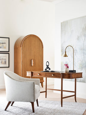 Just below the top of this versatile piece, a shelf pulls out to create a wide, functional desktop with generous work space. Beneath it, a false drawer-front drops down to reveal a keyboard shelf and power strip. Pair it with the Hudson Valley Two-Door Hutch.