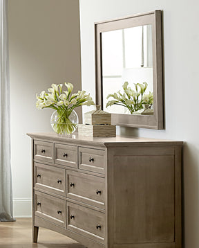 Origins by Stickley bedroom collection lifestyle showcasing a serene and sophisticated space with a panel bed, coordinating nightstand, and nine-drawer dresser with mirror. The furniture is finished in a soft, light tone that highlights the clean lines and transitional style, complemented by neutral bedding, fresh floral accents, and natural light filtering through sheer curtains for a calming, elegant look.