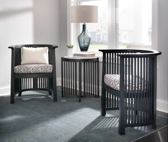 The Park Slope Accent Chair, with its sculptural arm rest and sheltering curve of tall square spindles, received the 2019 Design Impact Award from the American Society of Industrial Designers.