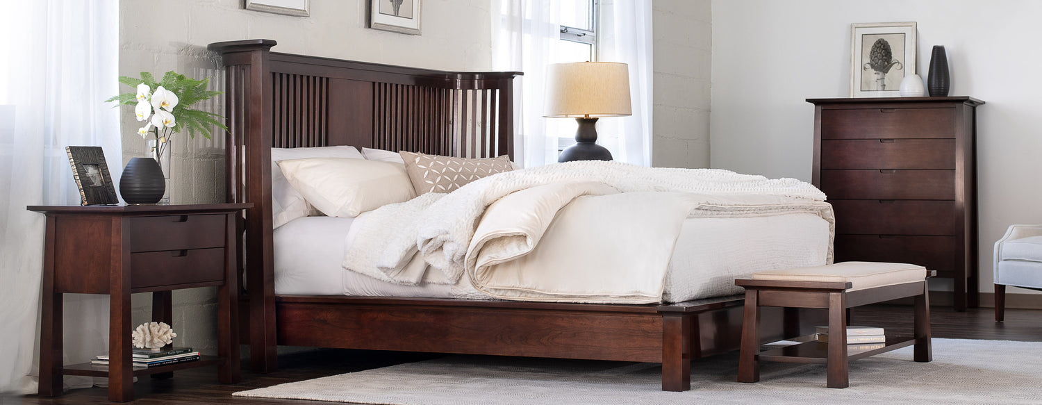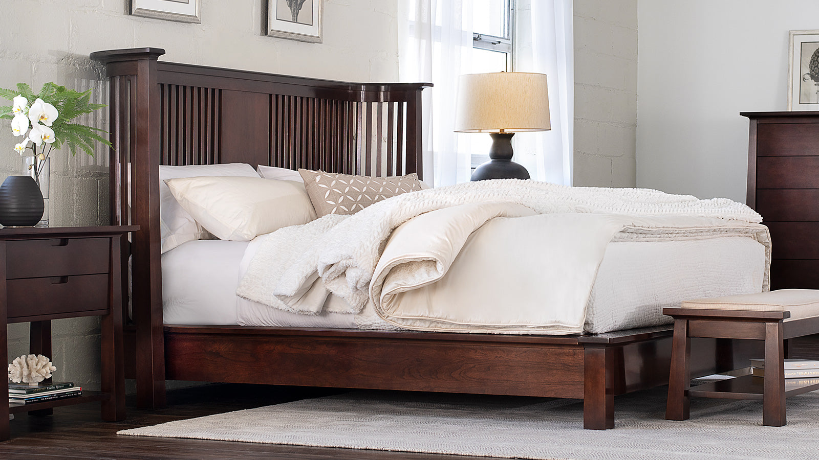 The Park Slope Platform Bed shows how a mid-century modern influence lightens the Arts and Crafts style. Its spindled wraparound headboard embraces the occupant, and a raised cantilever base adds airy space all around.