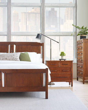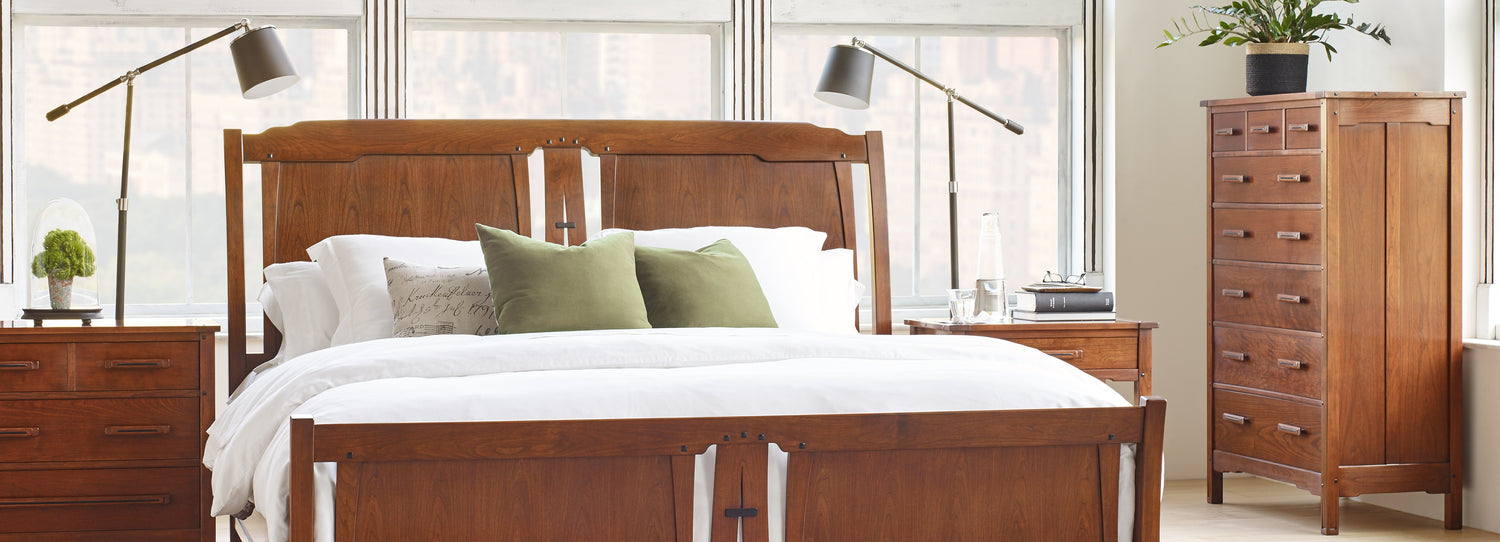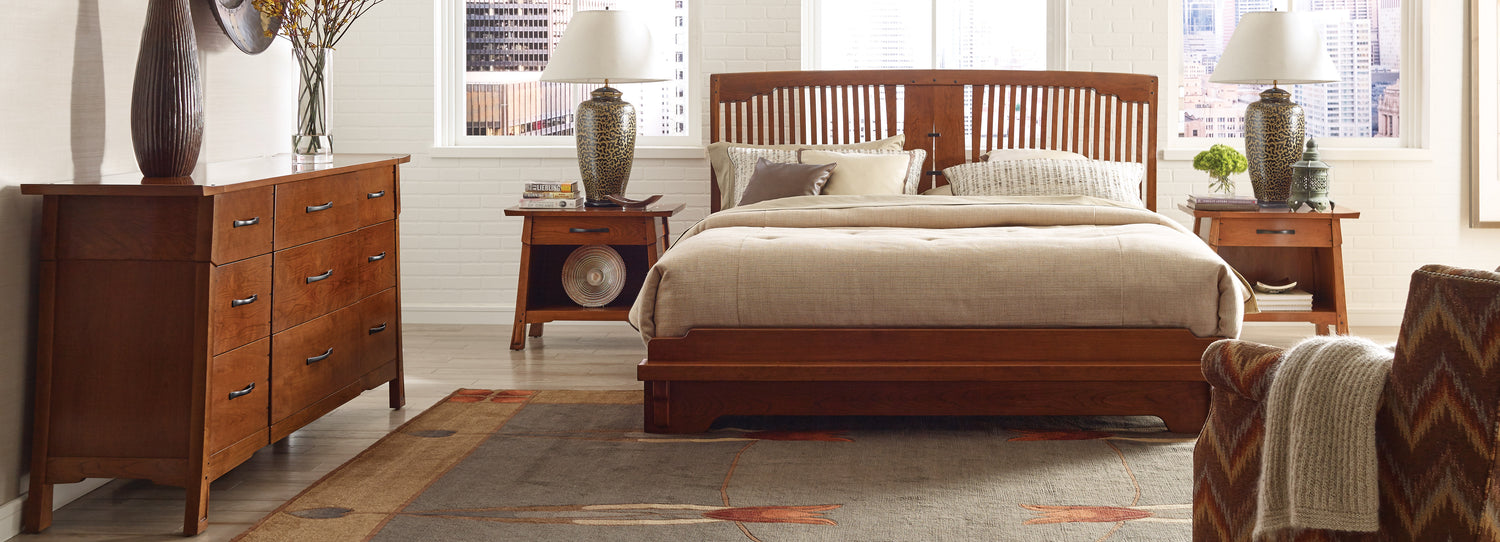 To showcase some of the variation within American Arts and Crafts style, we traveled west for inspiration from California Arts and Crafts homes and from the celebrated architects Greene & Greene. The sleek, fanciful designs of Pasadena Bungalow are crafted in solid wild cherry with blackwood accents.
