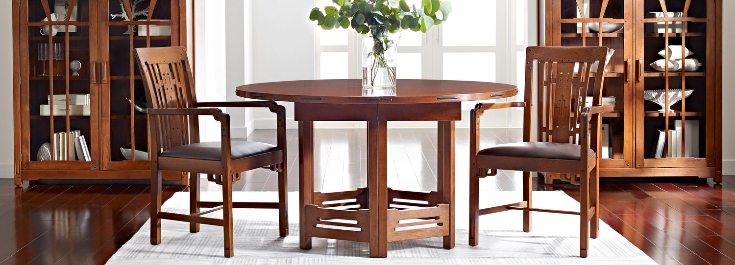 Design comes full circle with Pasadena Bungalow. Greene & Greene were influenced by Craftsman style and the furniture of Gustav and Leopold Stickley. Later, our designers were inspired by their hand-carved details and use of African Blackwood splines and pegs for both decoration and structure.