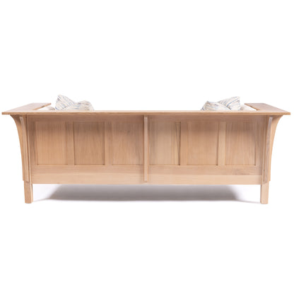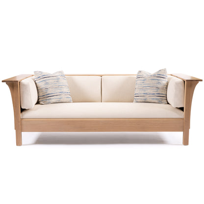 Based on an iconic 1910 L. & J. G. Stickley design, our Prairie upholstery embodies the Mission sensibility at its finest. The deeply comfortable Prairie Settle and Chair, available in solid oak or cherry, were part of the original 1989 Mission Collection reissue; both feature dramatic book-matched panels along the sides and back, as well as elongated corbeled arches that support generous wraparound arms. The settle includes two 20-inch throw pillows. In your choice of fabric or leather.