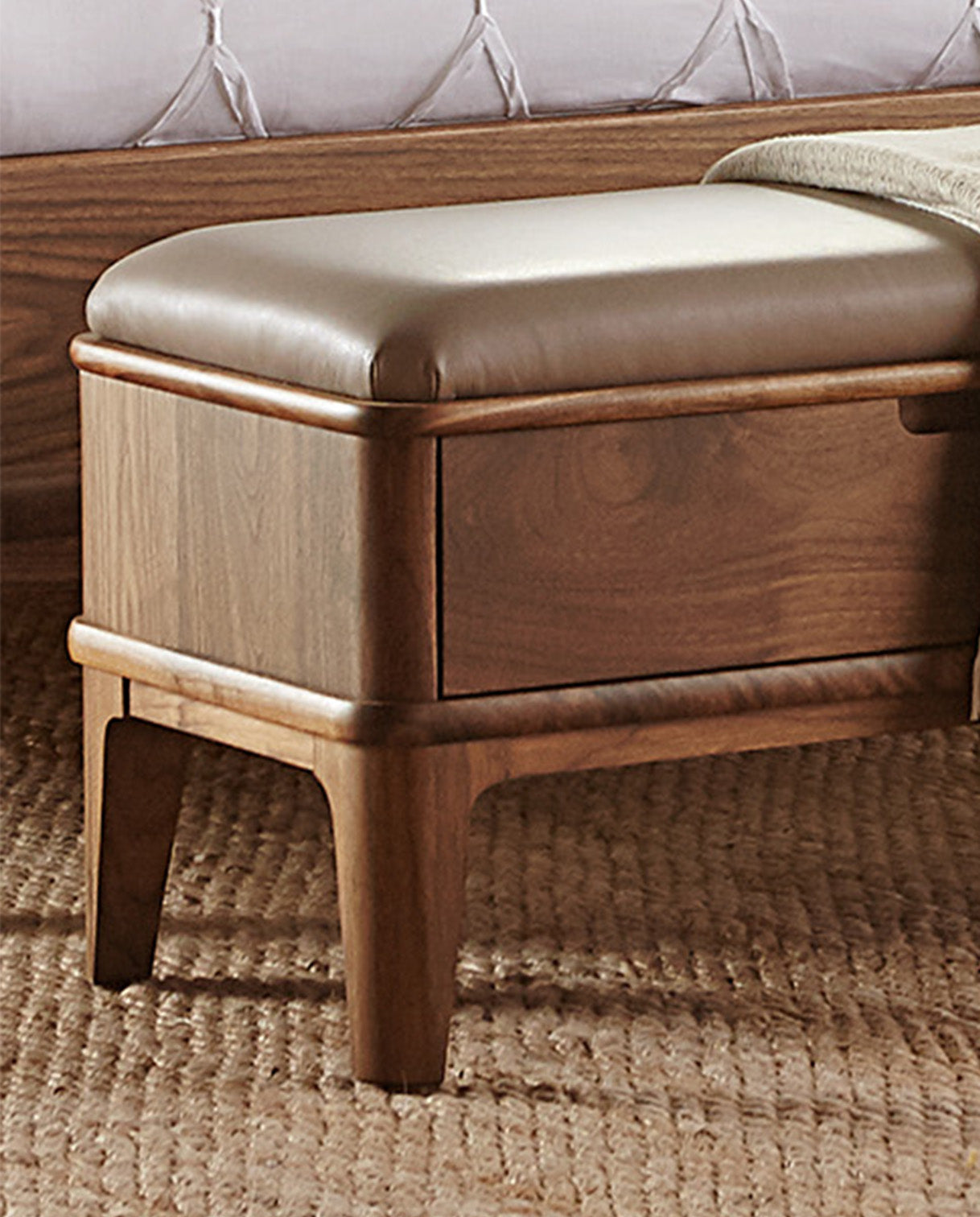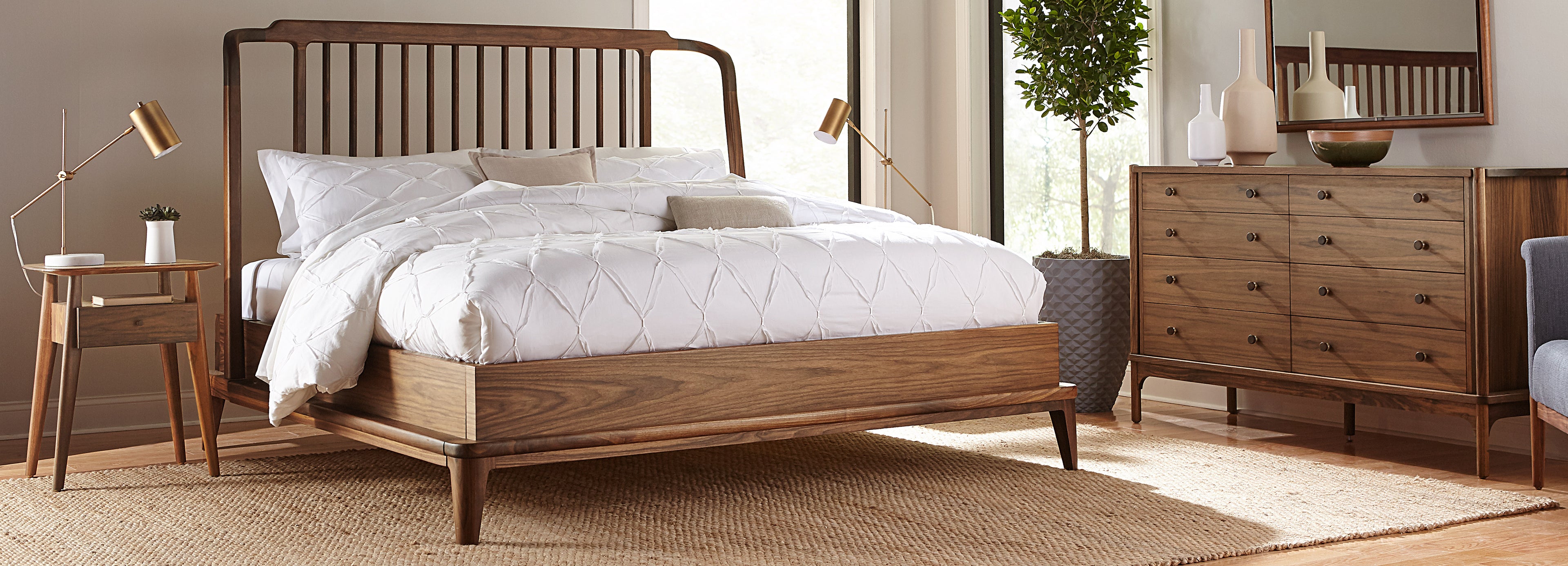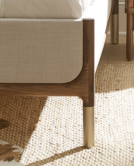 Hardware includes walnut knobs on turned metal bases and soft brass ferrules on the Upholstered Bed and Floor Mirror.