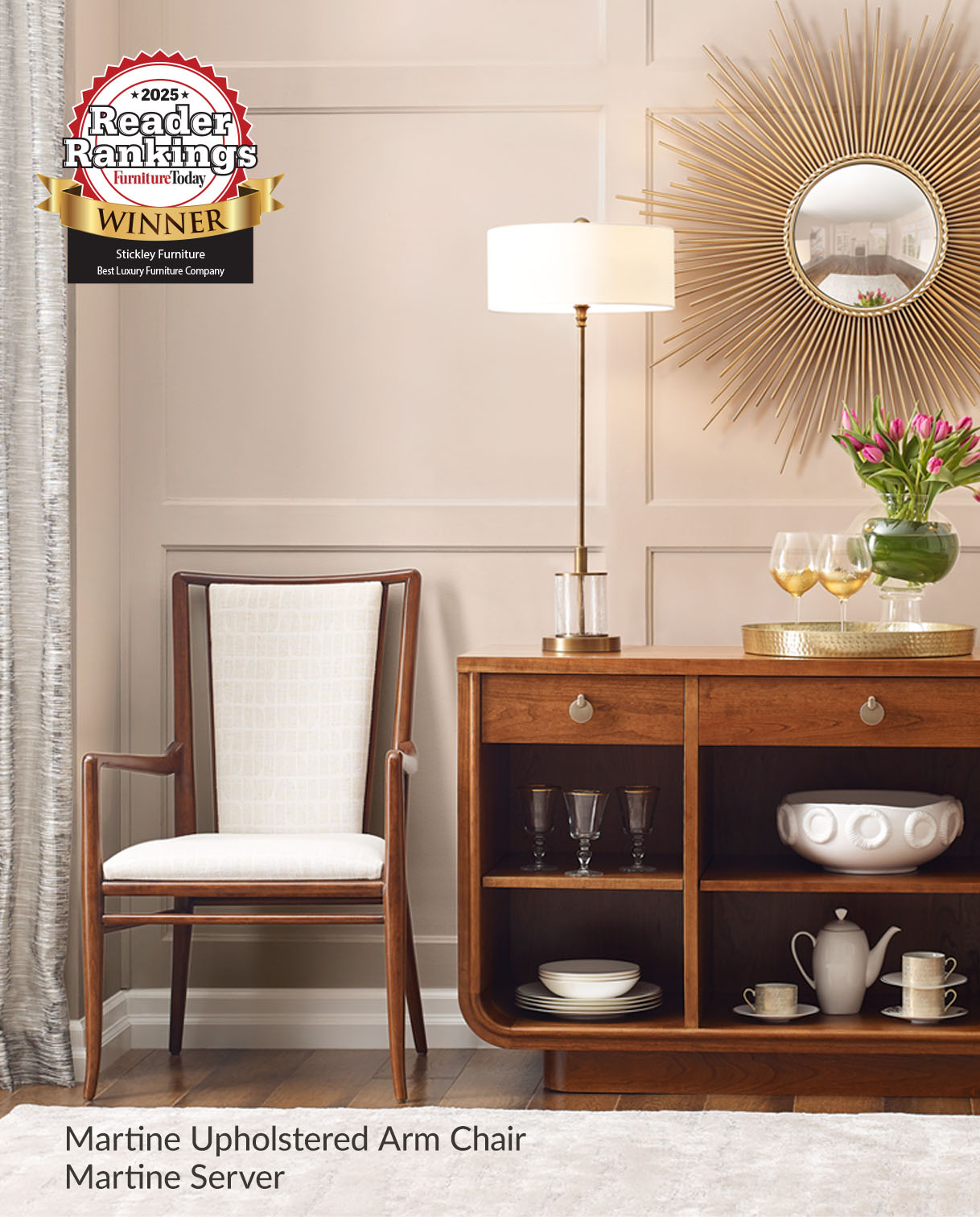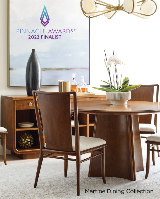 The Martine Sunburst Dining Table, Side Chair, and Server, nominated by the International Society of Furniture Designers in the Luxury Dining category.