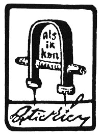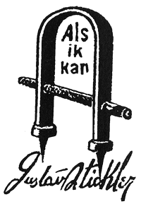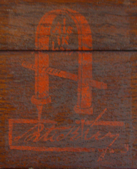 Gustav Stickley takes the rare step of labeling his Craftsman furniture with a shop mark. He chooses a joiner's compass as his logo with the phrase "Als ikkan" (To the best of my ability) inscribed within and his signature underneath.