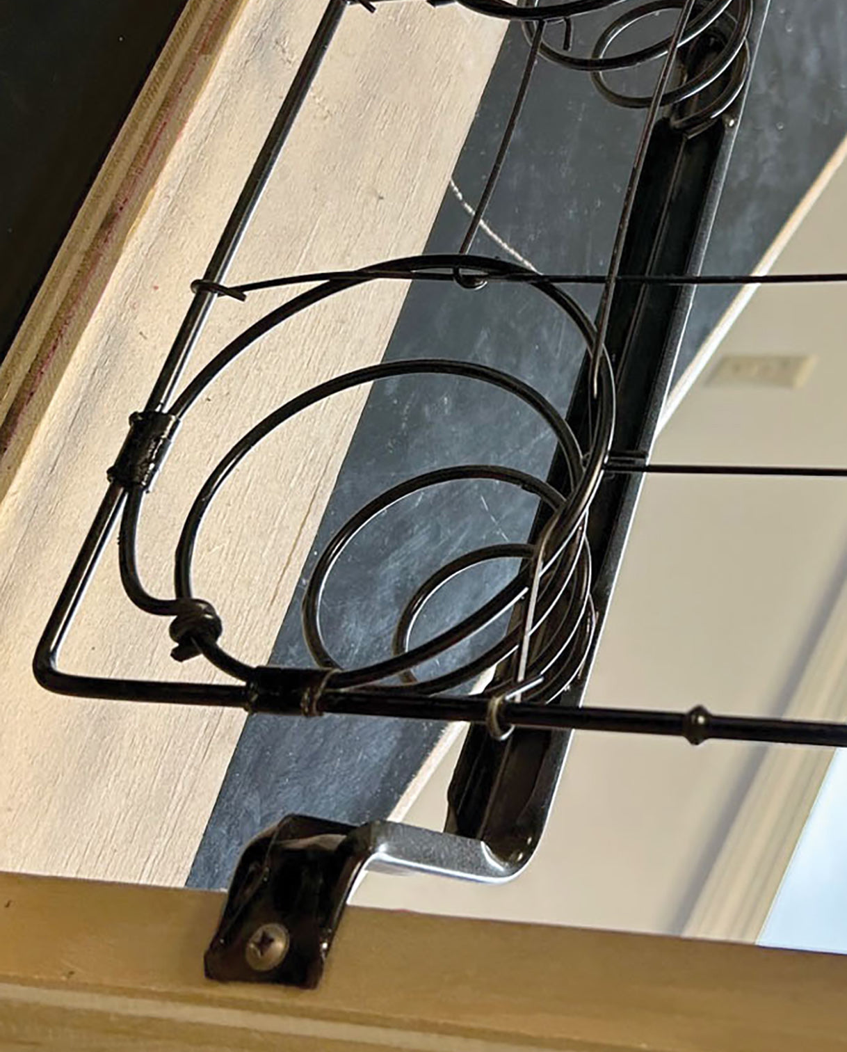 • Craftsman tying 8-way hand-tied coil springs with white twine in a hardwood chair frame during Stickley upholstery construction.