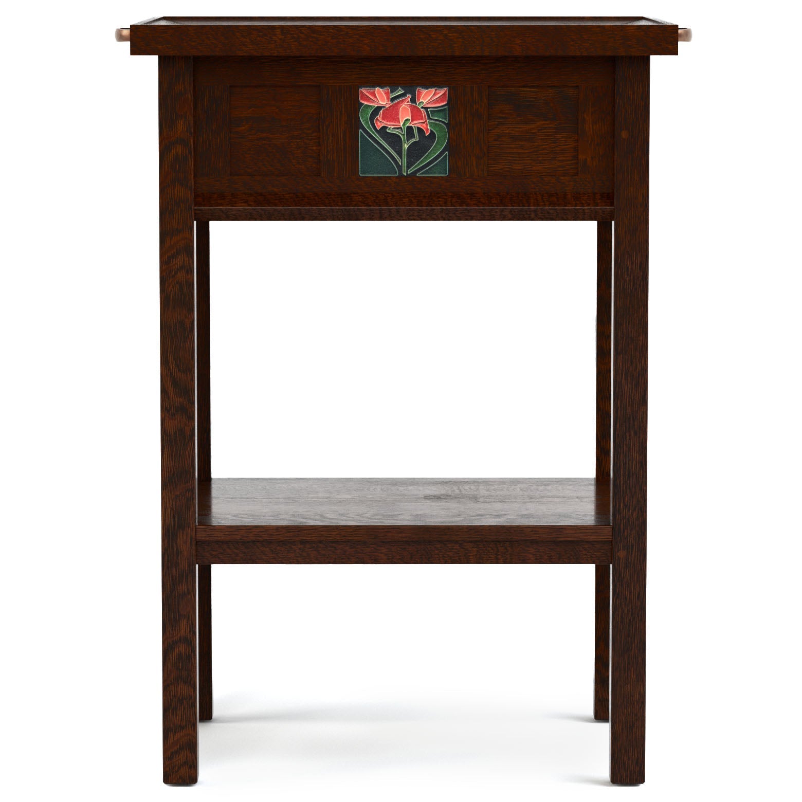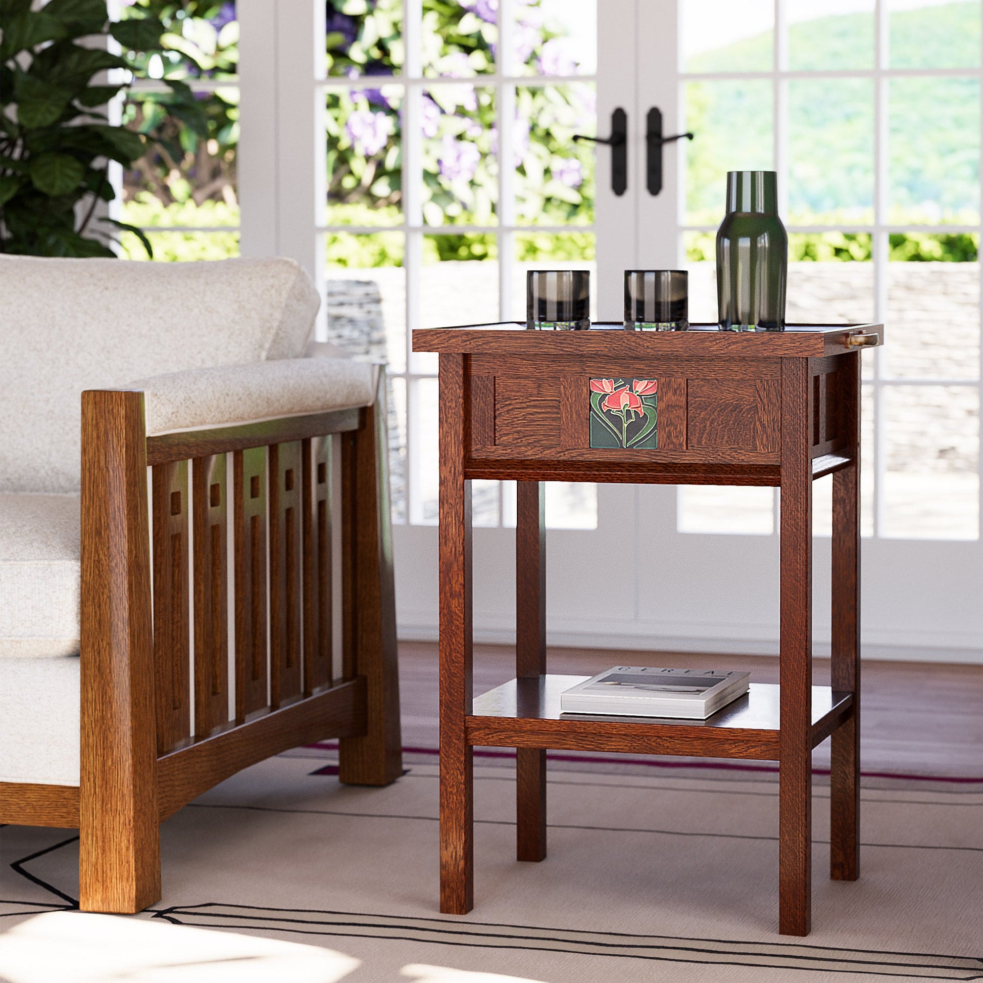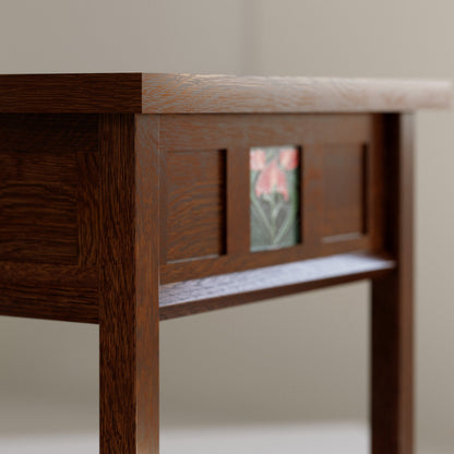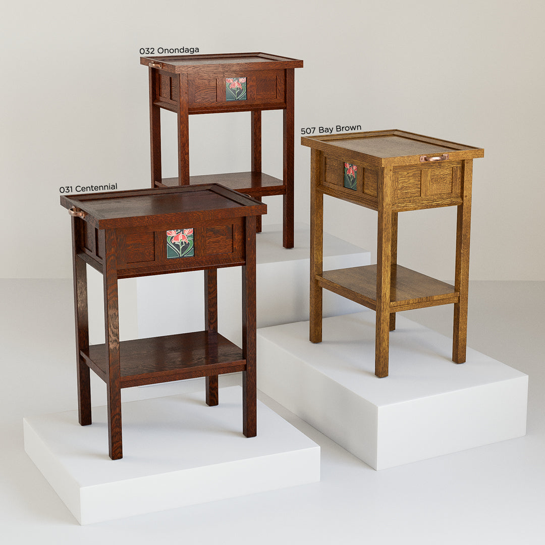 In honor of the 125th anniversary of Stickley's founding, the Floral Tile Collection has been thoughtfully designed to lend beautiful Mission personality and function throughout your home. The Tray Table features a removable tray top and a lower fixed shelf; the space beneath the tray offers a convenient finished interior space as well as access to its interchangeable Motawi Freesia tile, held in place with swiveling clips. Each piece in the collection is crafted in the USA of solid quartersawn white oak with mortise-and-tenon joinery.