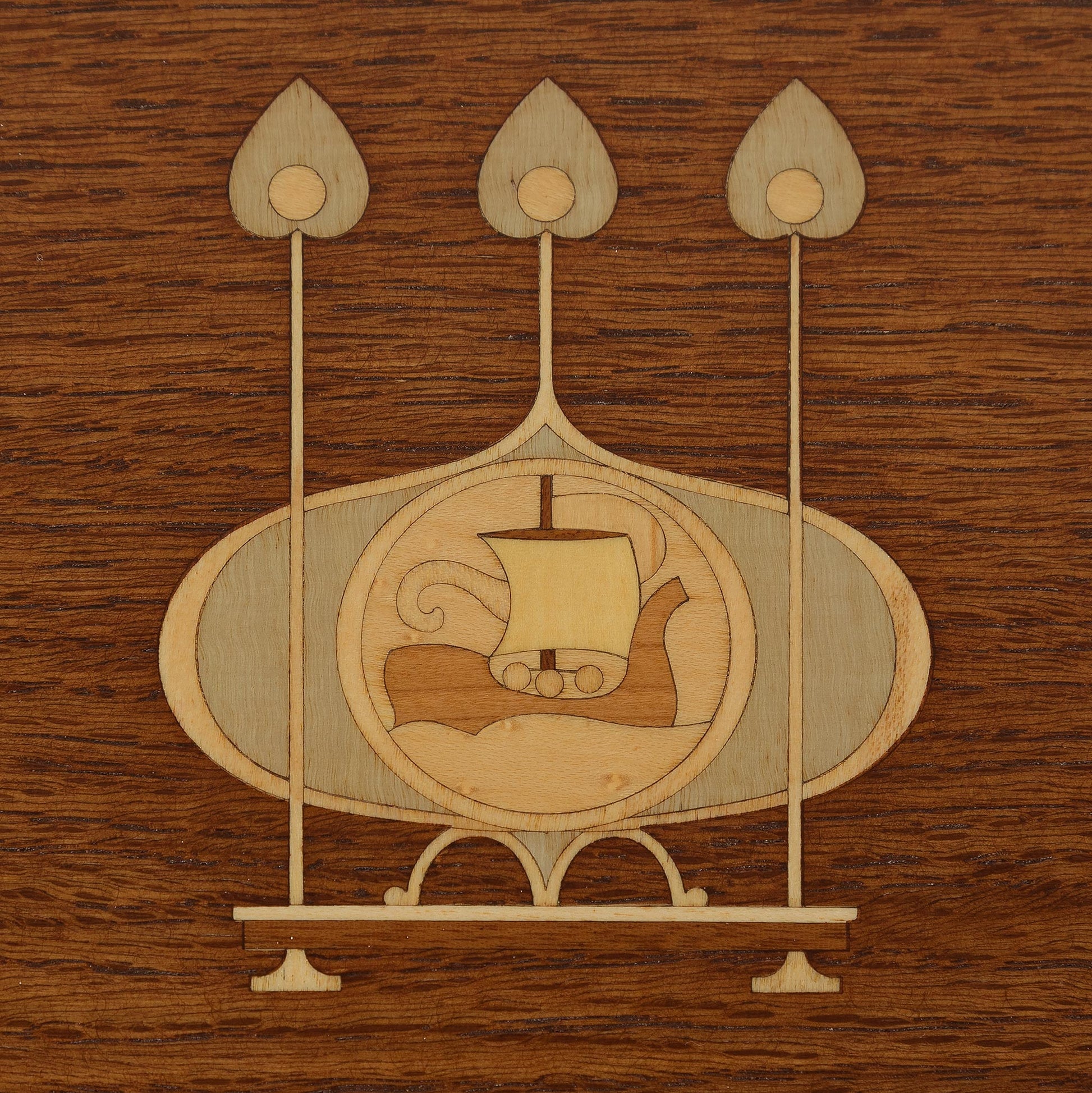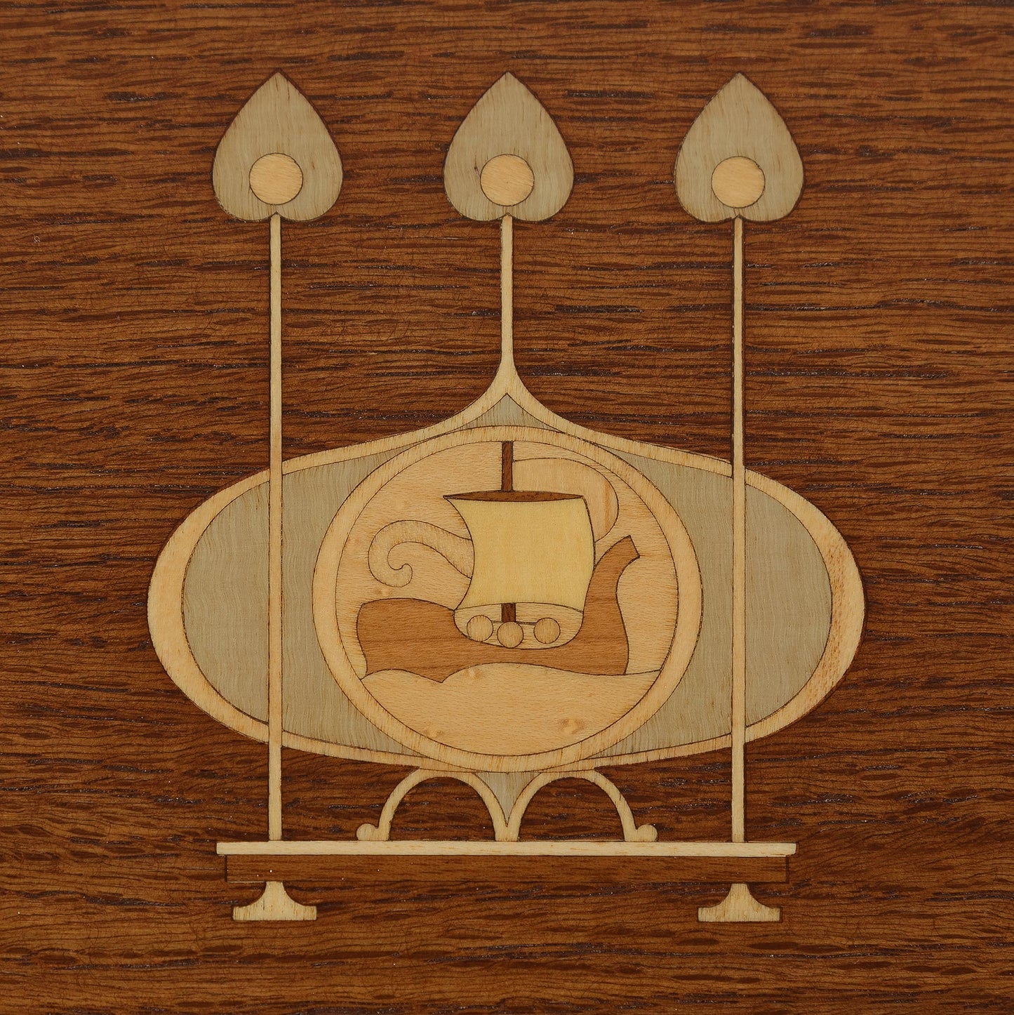 Harvey Ellis Viking-ship inlay of maple, dyed gray sycamore, cherry, magnolia, makore, and bird's-eye maple