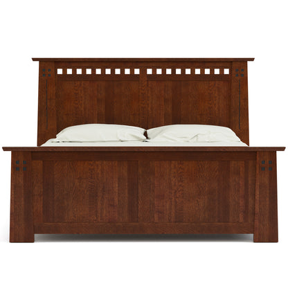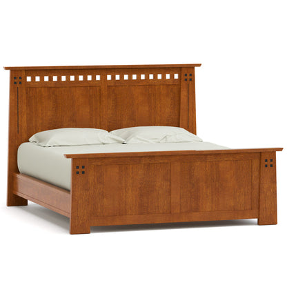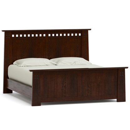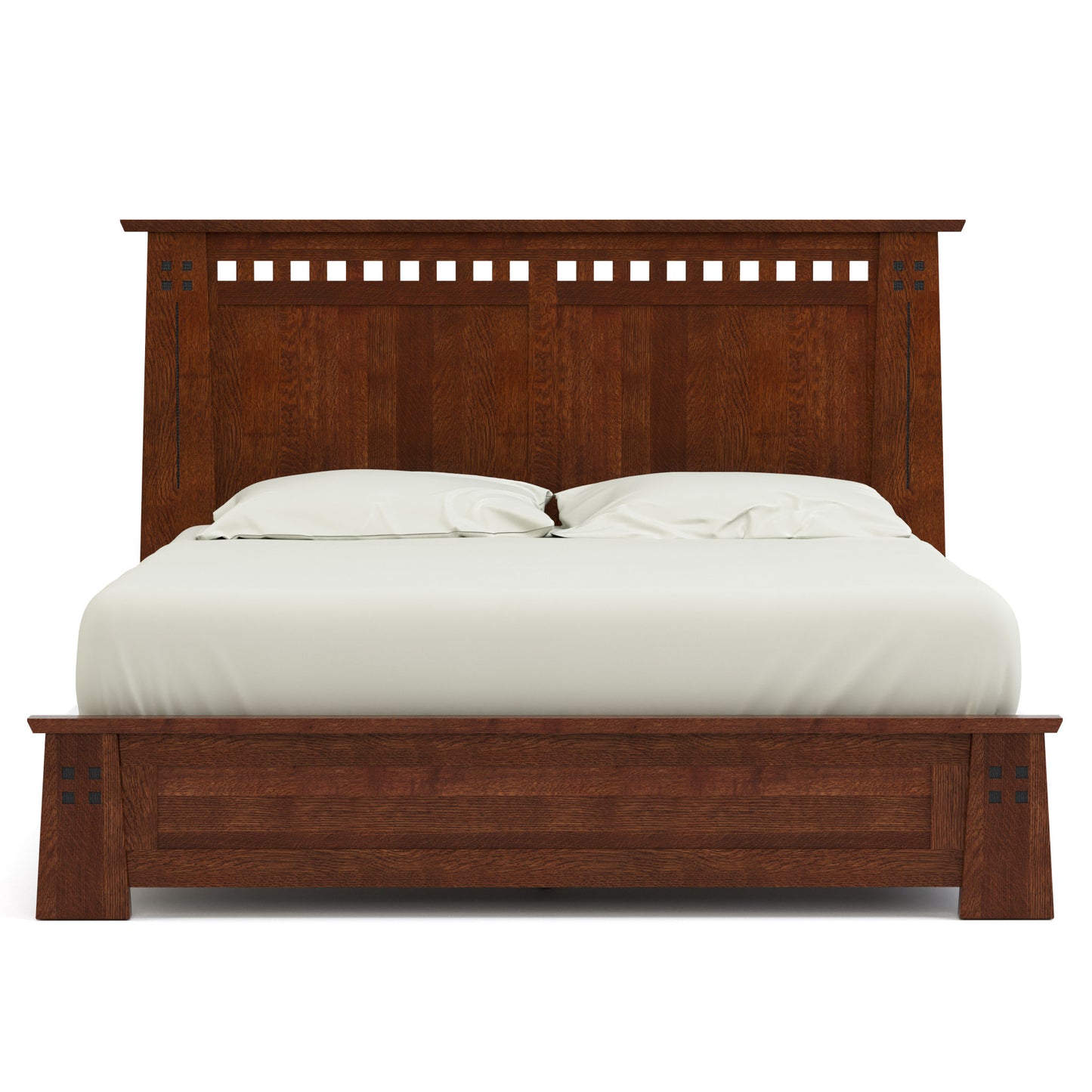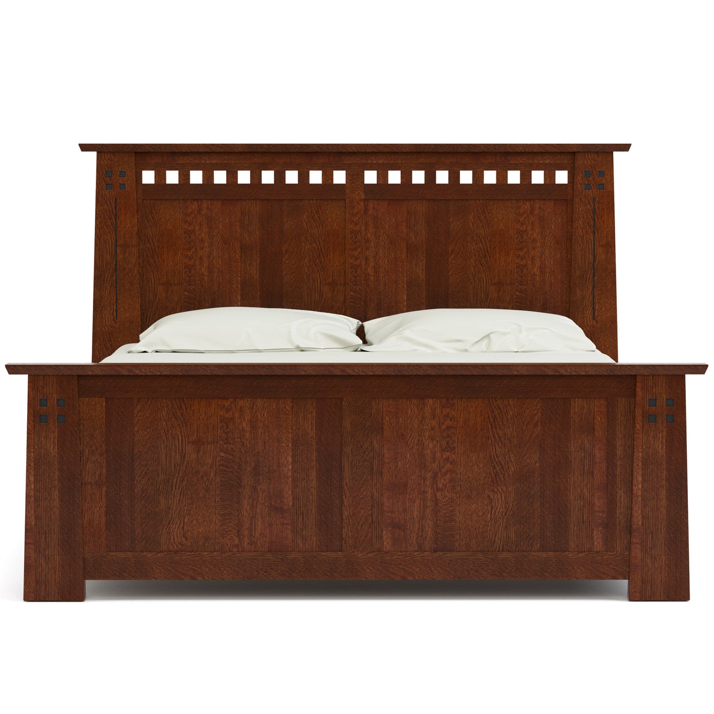 Cases feature Mission-style pyramidal knobs (dark copper on oak and light copper on cherry), as well as drop pulls on the Highlands bed with platform storage.