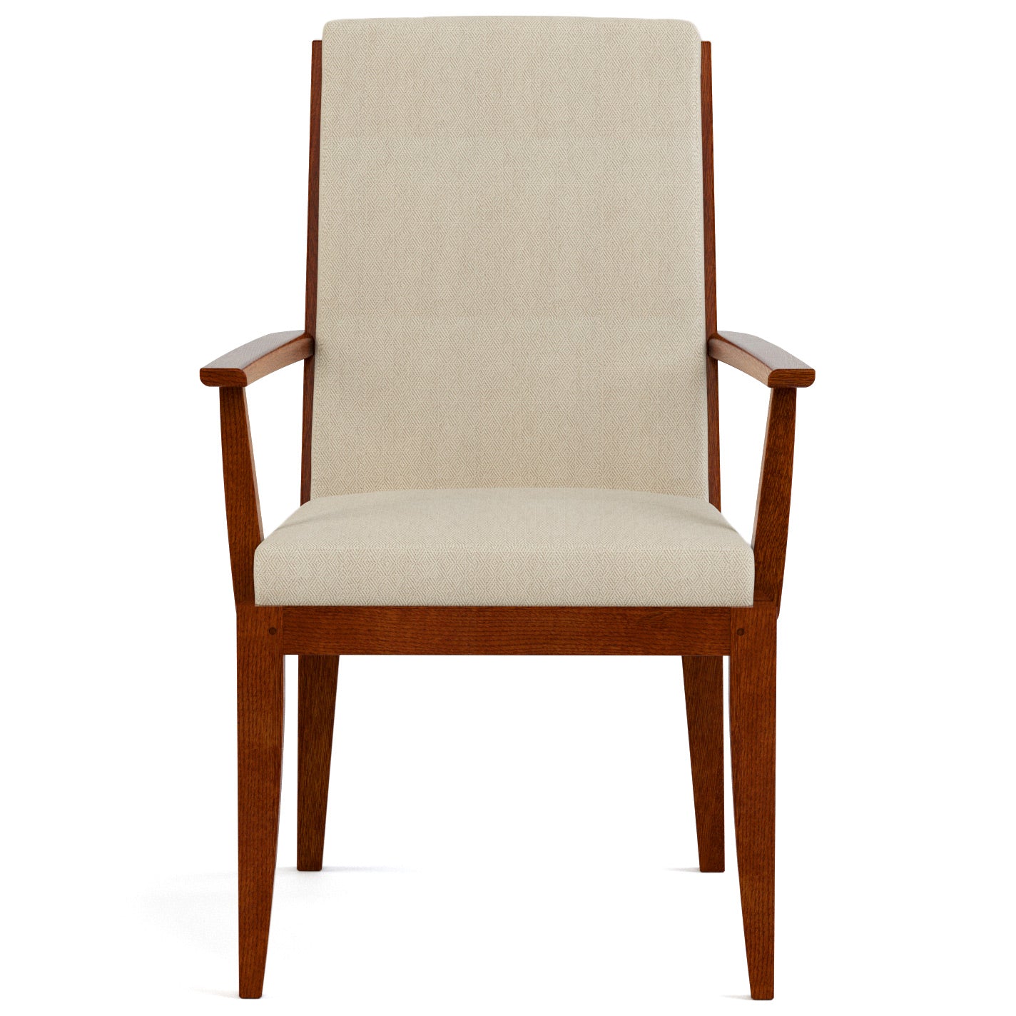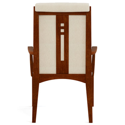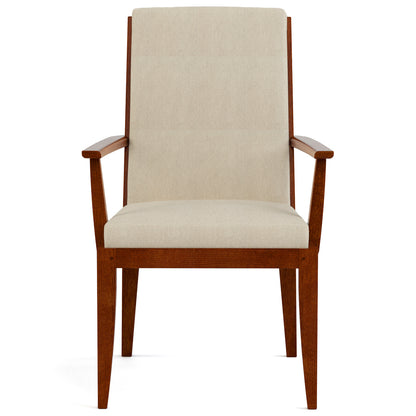 Named for the magical Scottish isle, our Skye Upholstered dining chairs bring the Highlands Collection a lovely new seating option. An elegant back splat borrows its pierced details from the Charles Rennie Mackintosh–inspired Highlands Trestle Table, while the smooth upholstered seat and back offer comfort and clean style. The Arm Chair's frame features gently tapered legs and shaped arms and is available in oak or cherry, with upholstery in any fine Stickley fabric or leather.