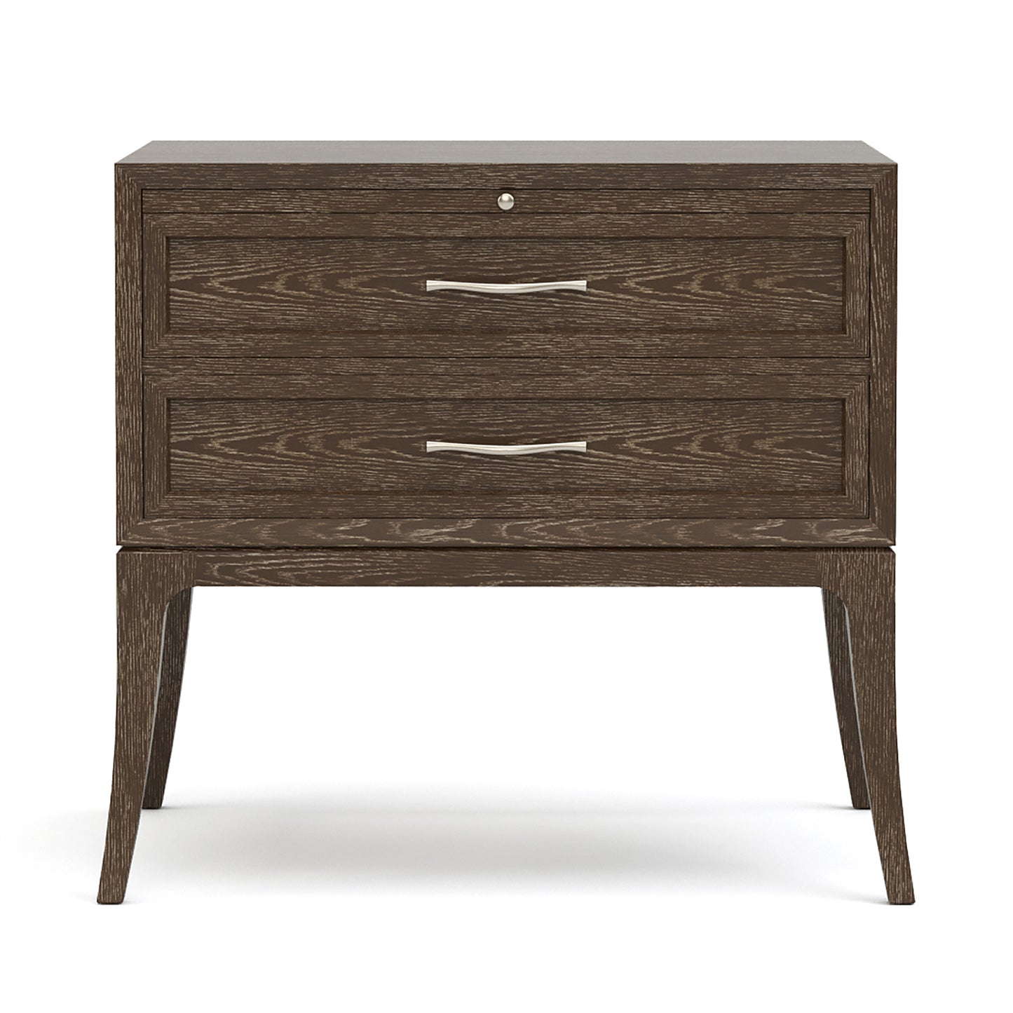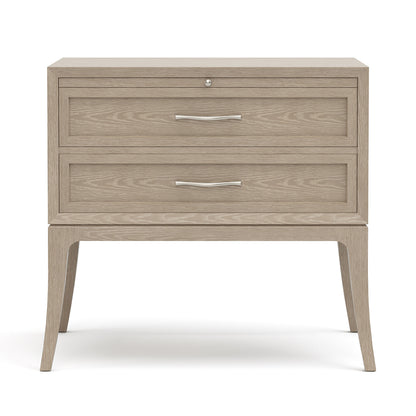 Standing tall on graceful saber legs, the Maidstone Nightstand features two side-hung, center-guided drawers with warm nickel branch pulls, as well as a pull-out tray that extends its surface area. All are enclosed by a narrow, beveled frame that floats above a slim reveal. Solid red oak in your choice of Pier or Sandbank finish.