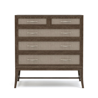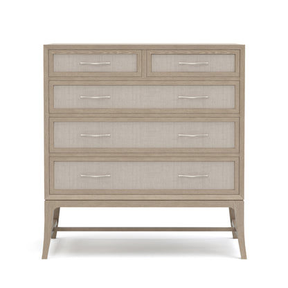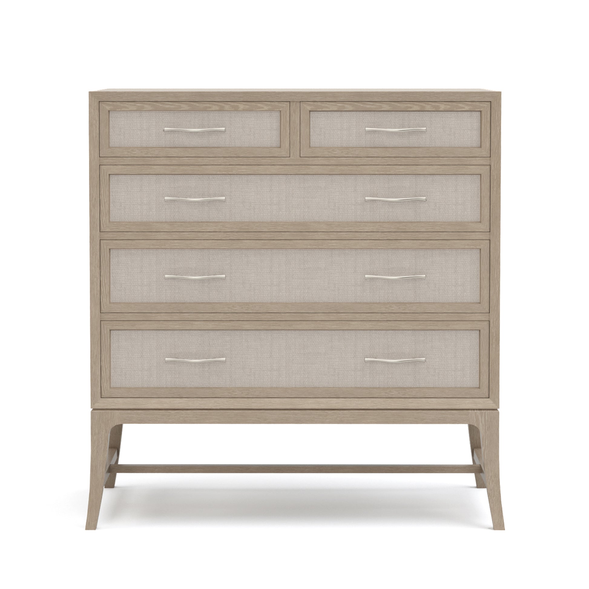 The Maidstone Tall Chest is lifted gently off the floor on tall, slender saber legs. Above this airy base, a wide, framed drawer case hovers above a slight reveal. Five side-hung, center-guided drawers with woven jute fronts and warm nickel branch pulls provide roomy storage. Solid red oak in your choice of Pier or Sandbank finish.