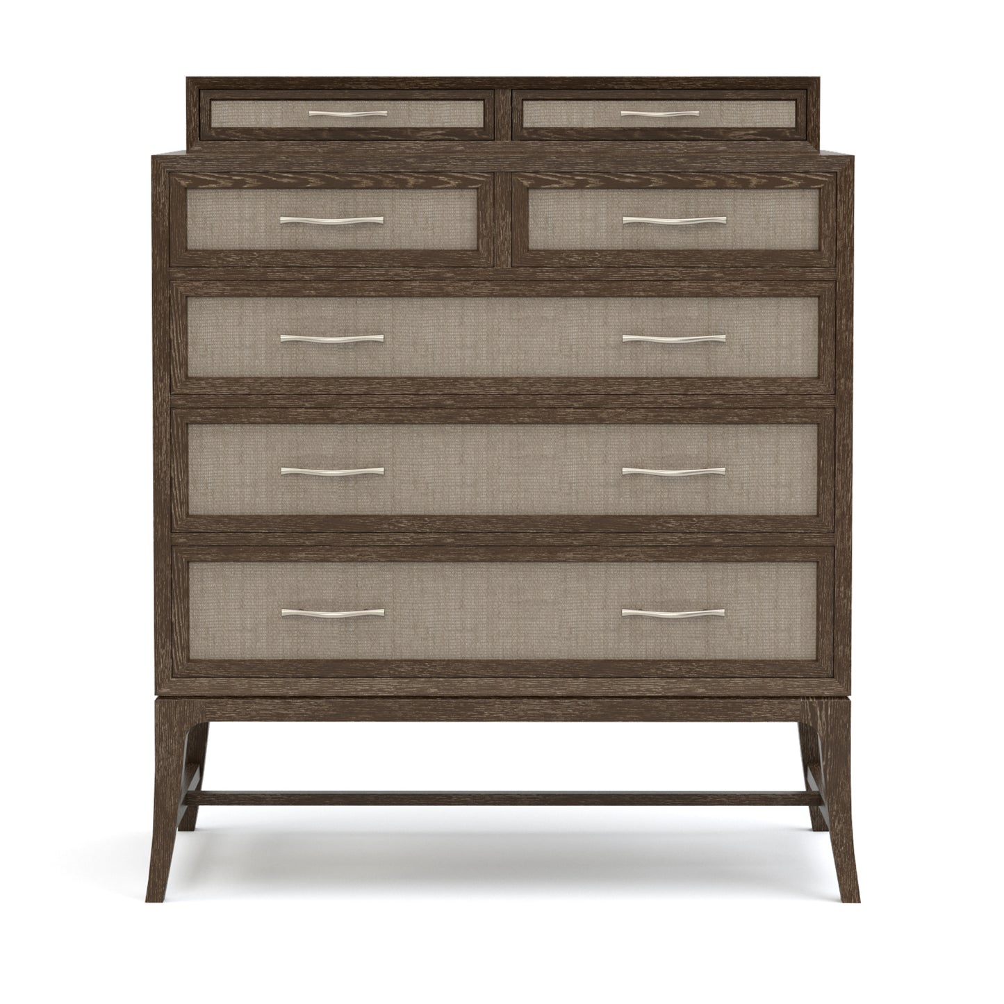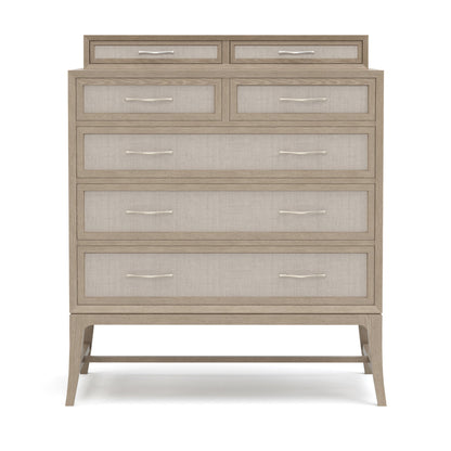 The Maidstone Tall Chest is lifted gently off the floor on tall, slender saber legs. Above this airy base, a wide, framed drawer case hovers above a slight reveal. Five side-hung, center-guided drawers with woven jute fronts and warm nickel branch pulls provide roomy storage, and a 4.5-inch gallery on top adds two more set-back drawers with velvet lining and a jewelry tray. Solid red oak in your choice of Pier or Sandbank finish.