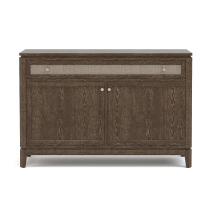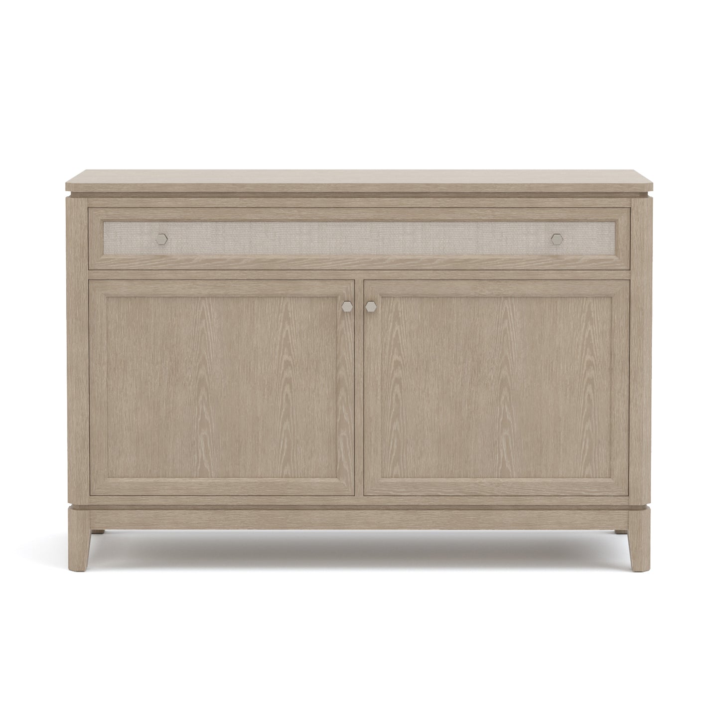 The Maidstone Two-Door Console is a multi-functional piece that lends itself to most any room. It features a wide side-hung, center-guided drawer with a woven jute front and two doors that conceal an adjustable shelf; a rear cutout for wire management allows for use with media components. Hexagonal knobs of warm nickel add a subtle glow, while neatly chamfered corners and reveals above and below the case lighten and soften its style. Solid red oak in your choice of Pier or Sandbank finish.