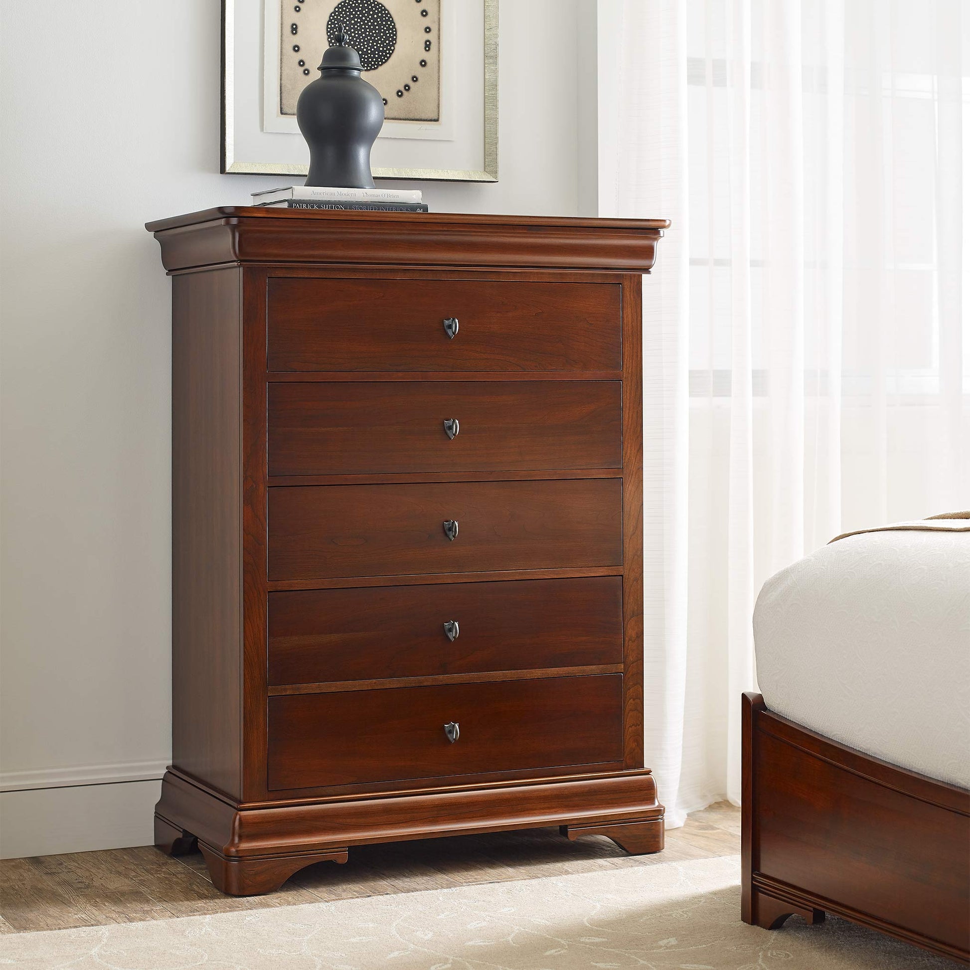 The Marseilles Tall Chest features five drawers with faux key pulls and a generously moulded top that conceals a single drawer with a velvet drawer bottom liner. Solid cherry.