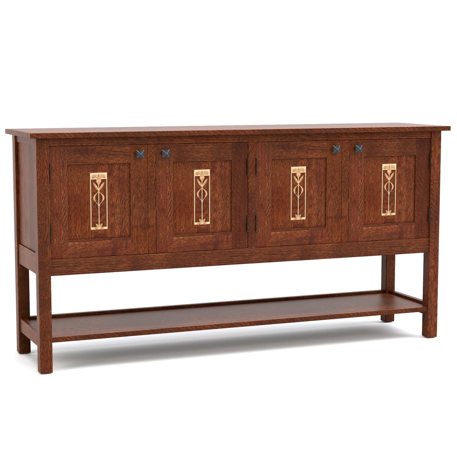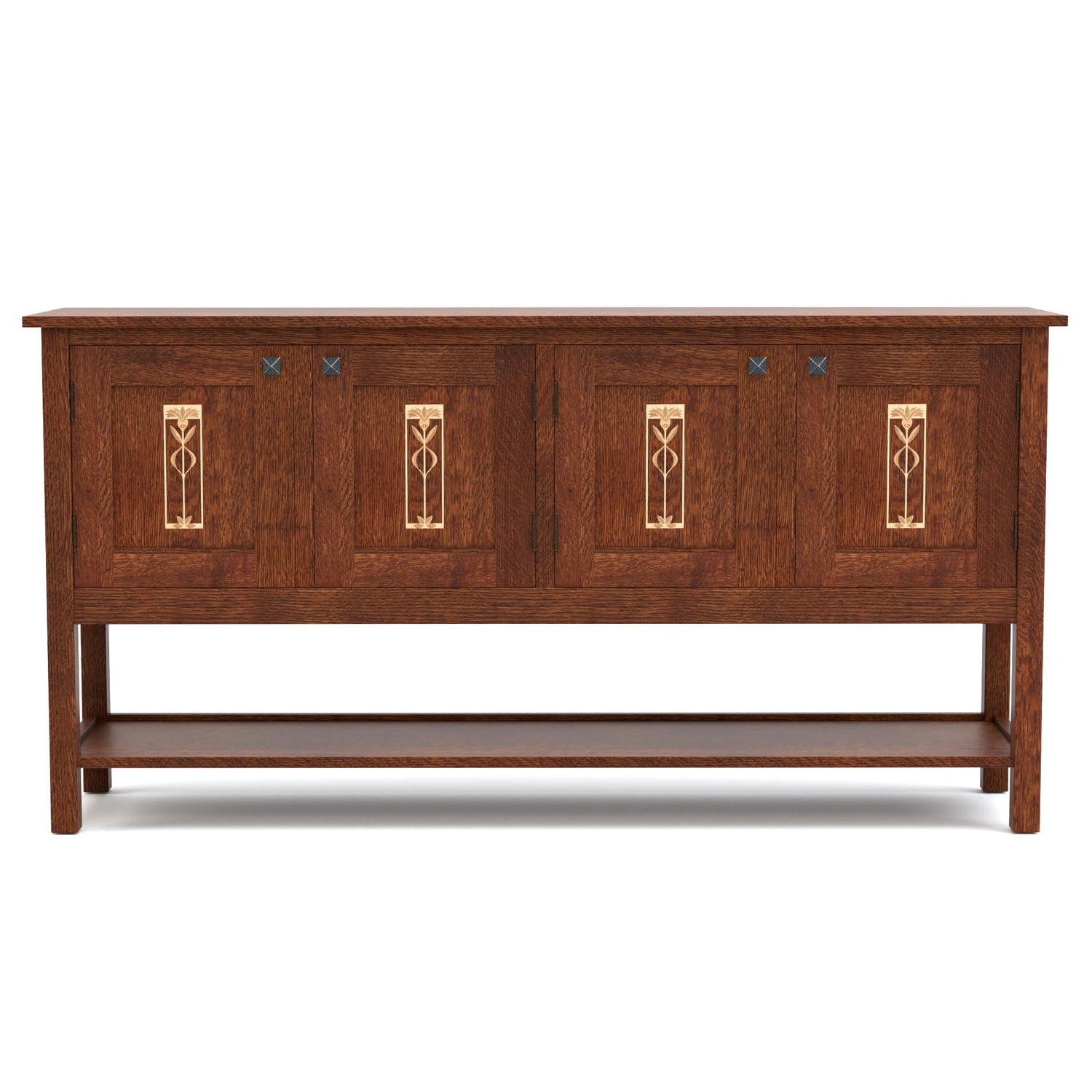 Crafted of white oak and inspired by our 2022 Collector Edition, the Meadowflower Four-Door Sideboard is a spacious dining room piece that also works as a multipurpose console. The doors, featuring stylized modern inlays depicting cornflower and mint, conceal a single adjustable shelf on either side. A lower shelf provides additional storage, while hammered pyramidal knobs complete the Mission look.