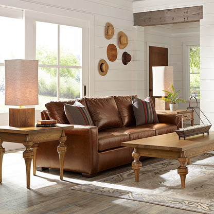Our Memphis Sofa makes a dramatic statement in rich, gently aged leather. A broad six-inch track arm and architectural block feet give it modern lines and a commanding presence, while deep, ultra-plush seat cushions invite you to sink in. Available in two Savoy leathers for Express Ship.