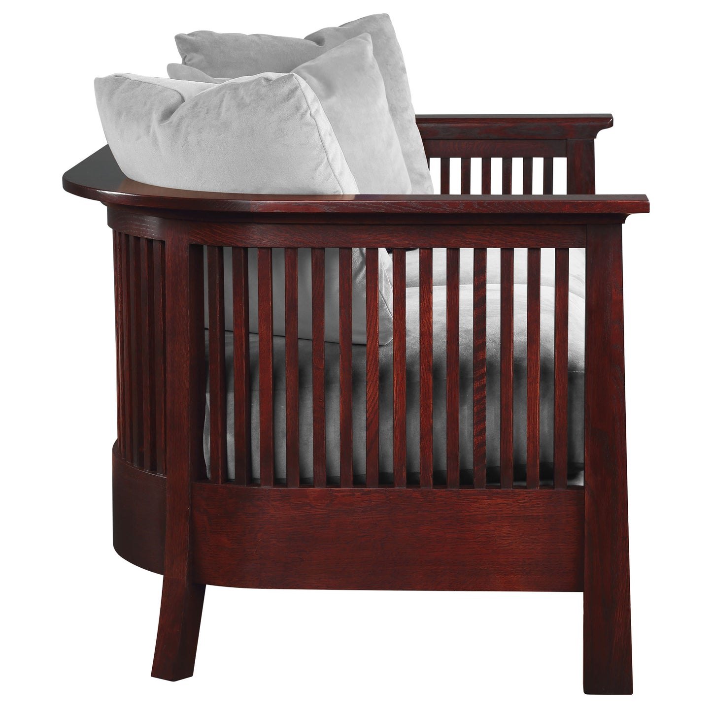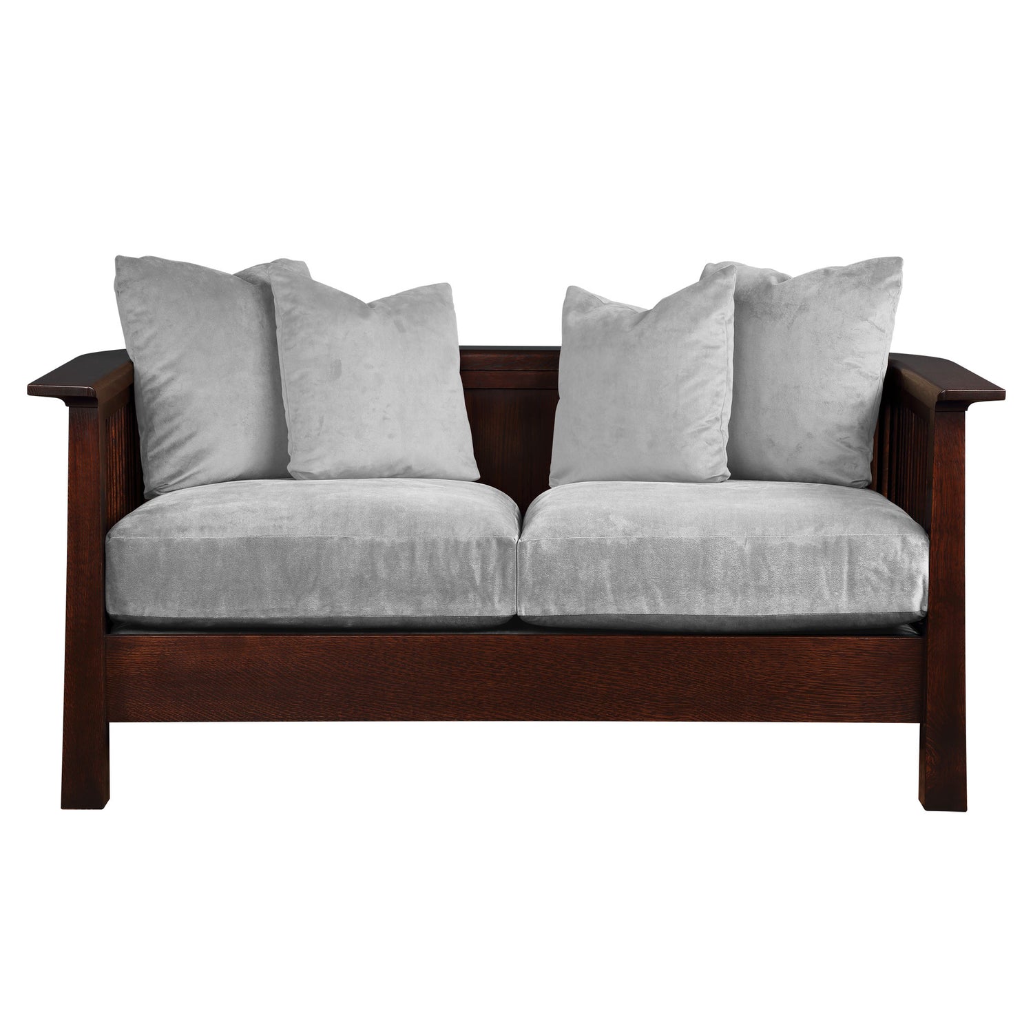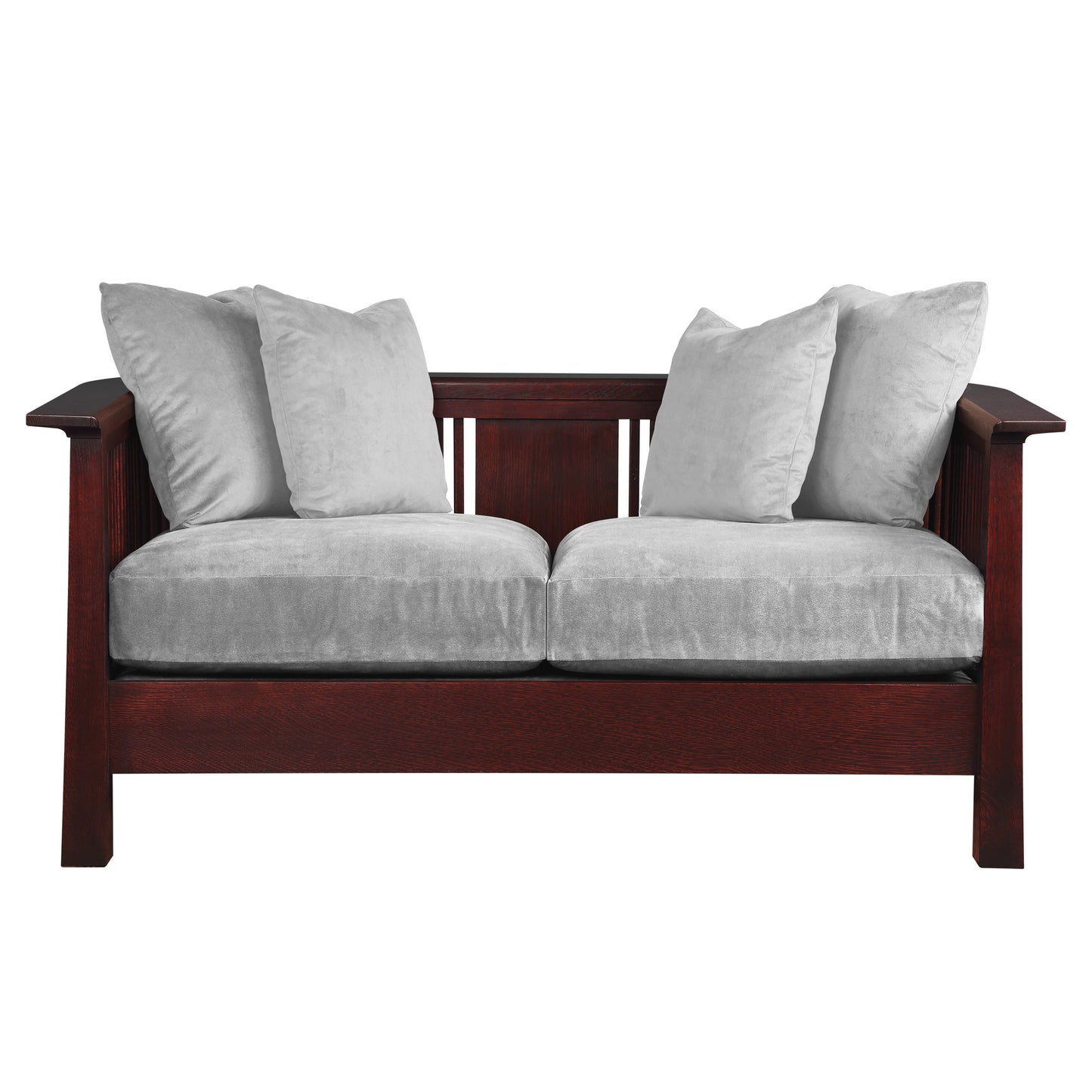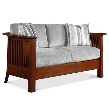 In Park Slope's loveseat, plush cushions live within a frame of tall spindles that curve into a sheltering embrace. It's a lightened Arts and Crafts form that is both visually striking and deeply comfortable. Available in solid quartersawn oak or cherry.