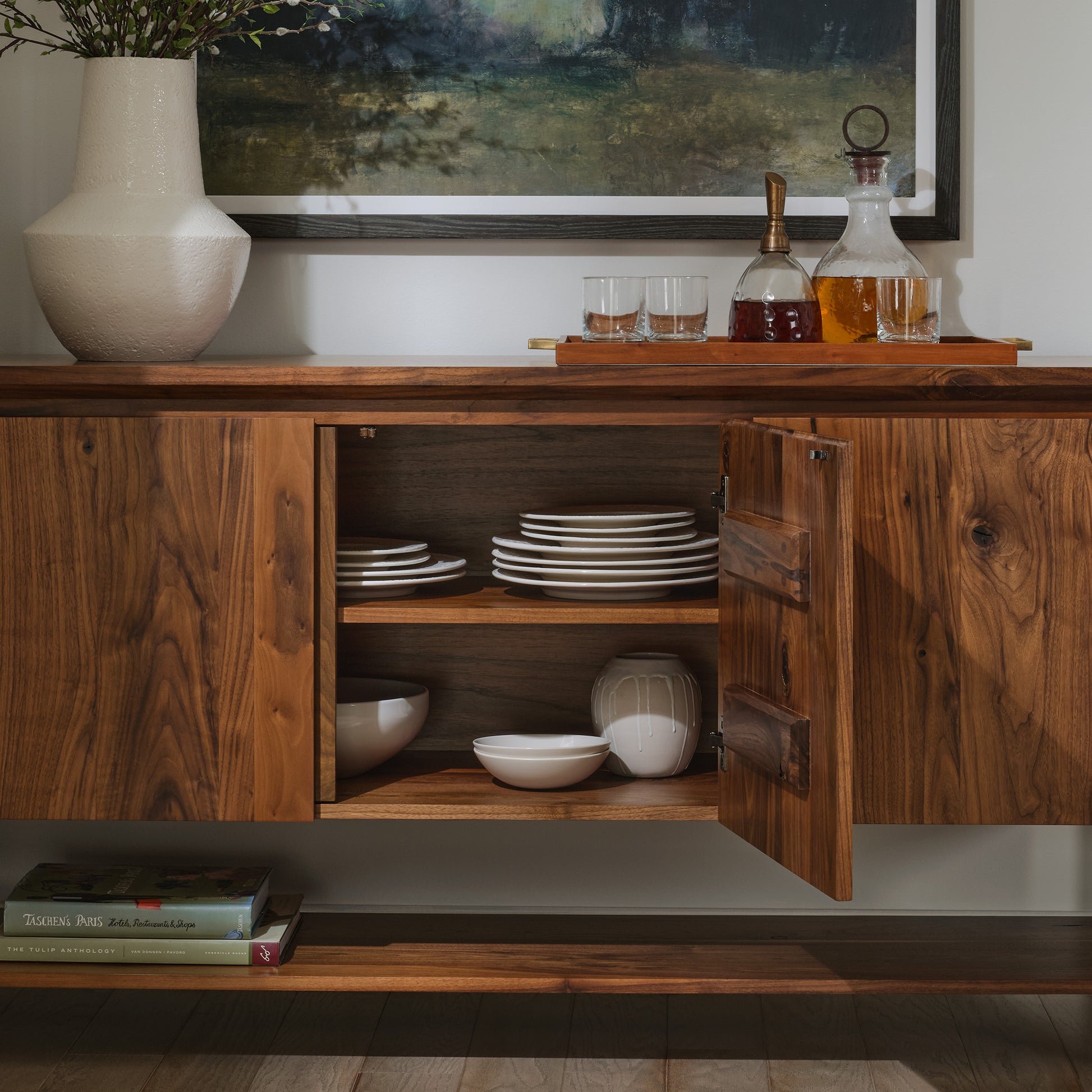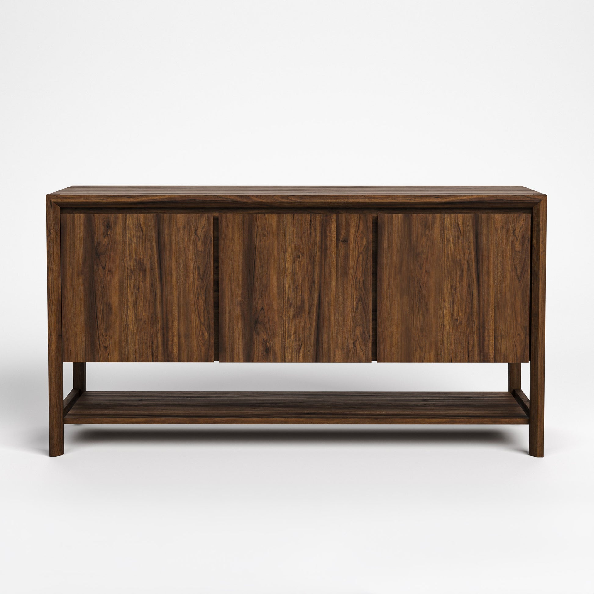 The Saranac Sideboard features three doors concealing a wide compartment on the left and narrow compartment on the right, each with an adjustable shelf. A lower shelf provides additional storage. The Saranac Collection is a beautiful example of the sustainable use of timber, crafted from rustic offcuts of black walnut with dramatic knots, surface checks, and swirls of light and dark that are unique from one piece to the next.