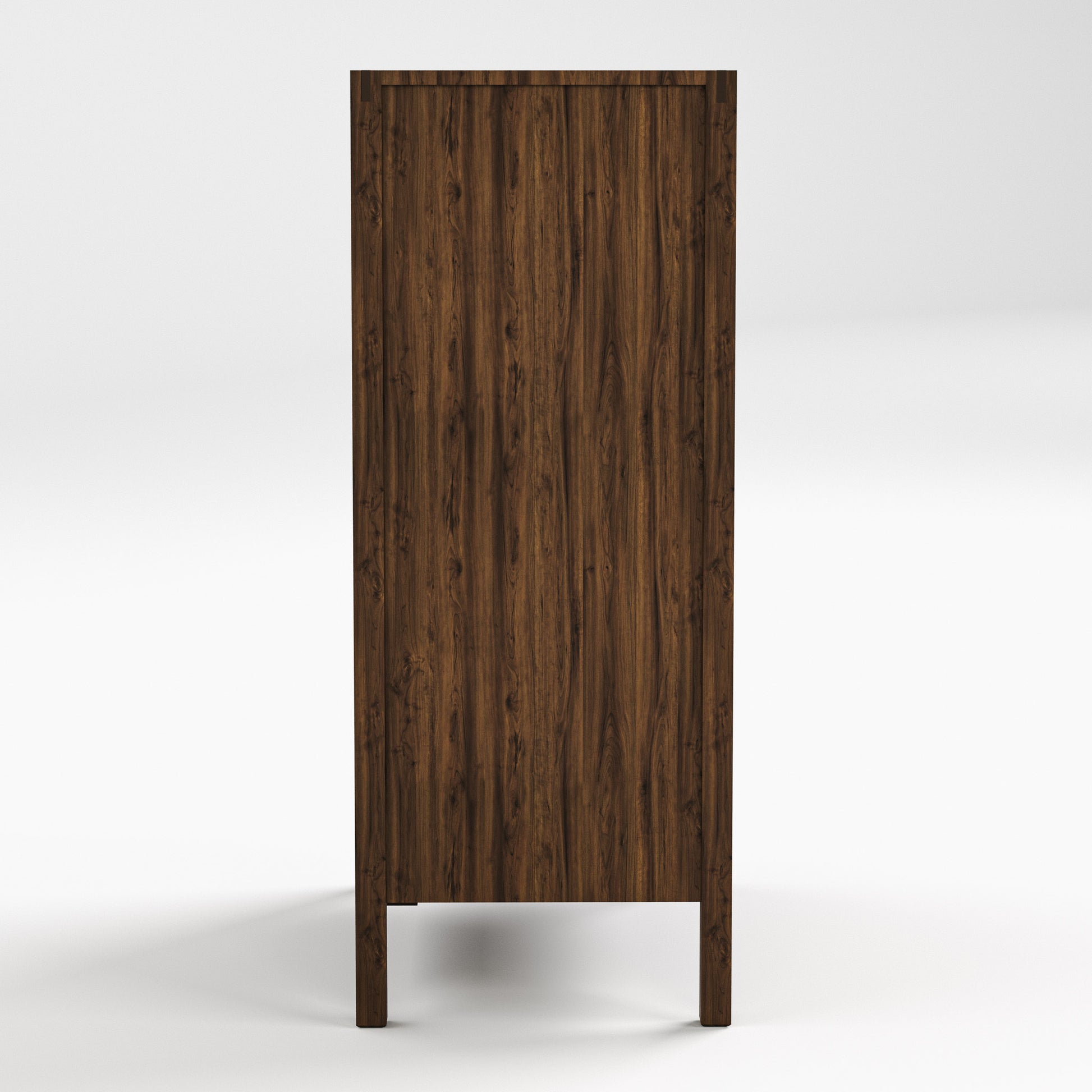The Saranac Tall Chest shows off Stickley craftsmanship at its finest, with mortise-and-tenon joinery, splined corners, and five side-hung, center-guided drawers featuring sturdy, dovetailed boxes and finger pulls in place of hardware. The Saranac Collection is a beautiful example of the sustainable use of timber, crafted from rustic offcuts of black walnut with dramatic knots, surface checks, and swirls of light and dark that are unique from one piece to the next.