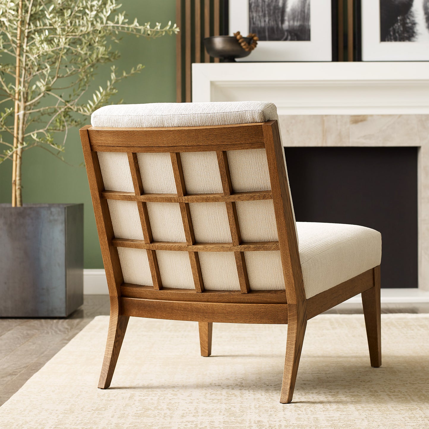Our Arts and Crafts motif gets a contemporary treatment in this "casual cool" slipper chair. The trellis grid becomes a slightly curved back panel with side rails that bend into angled rear legs. A tight back cushion nests in the white oak frame above a generous tight seat.