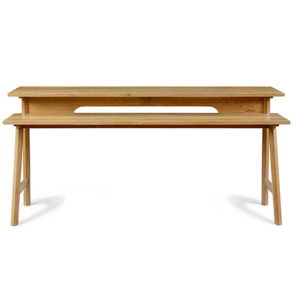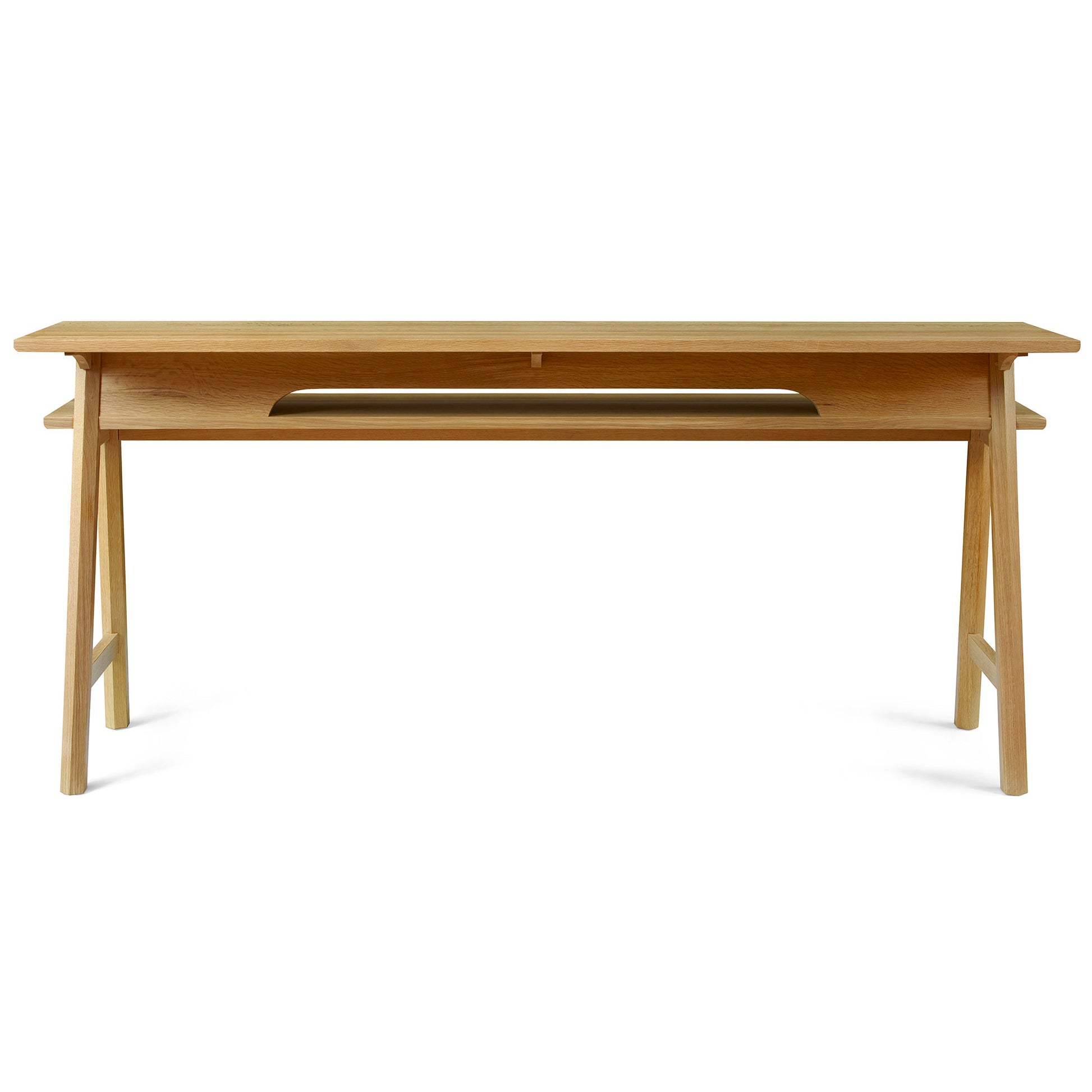 Surrey Hills offers its own version of Stickley's patented Gathering Island, beautifully crafted from quartersawn white oak. Hexagonal legs support a two-tiered tabletop whose lower surface aligns with the back of a sofa, providing a handy space for drinks or snacks. The upper surface, raised for an unobstructed view of a TV screen, can also serve as an open workspace; a slot allows for wire management for laptops and monitors. The Gathering Island pairs perfectly with Mission stools like the Backless Counter Stool.