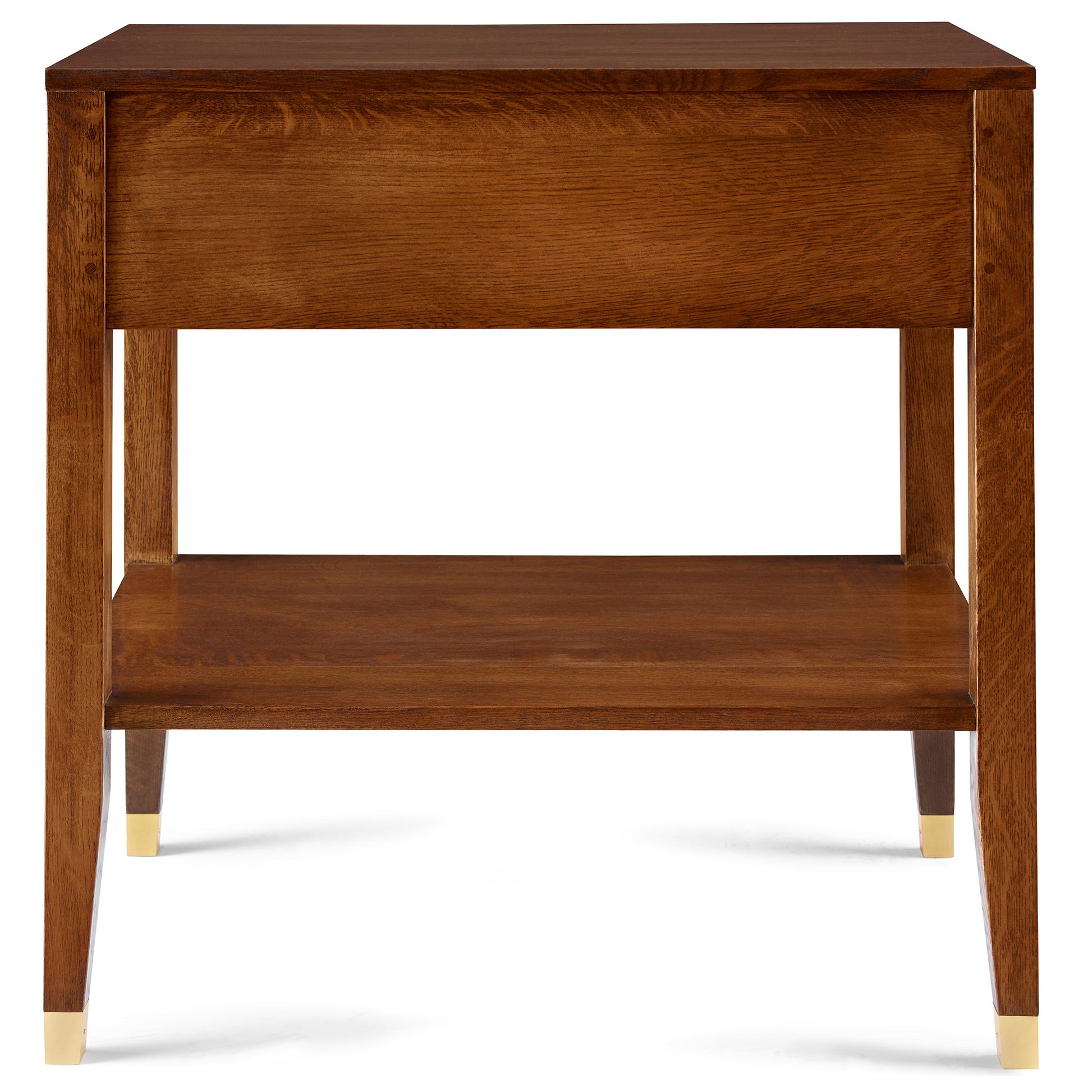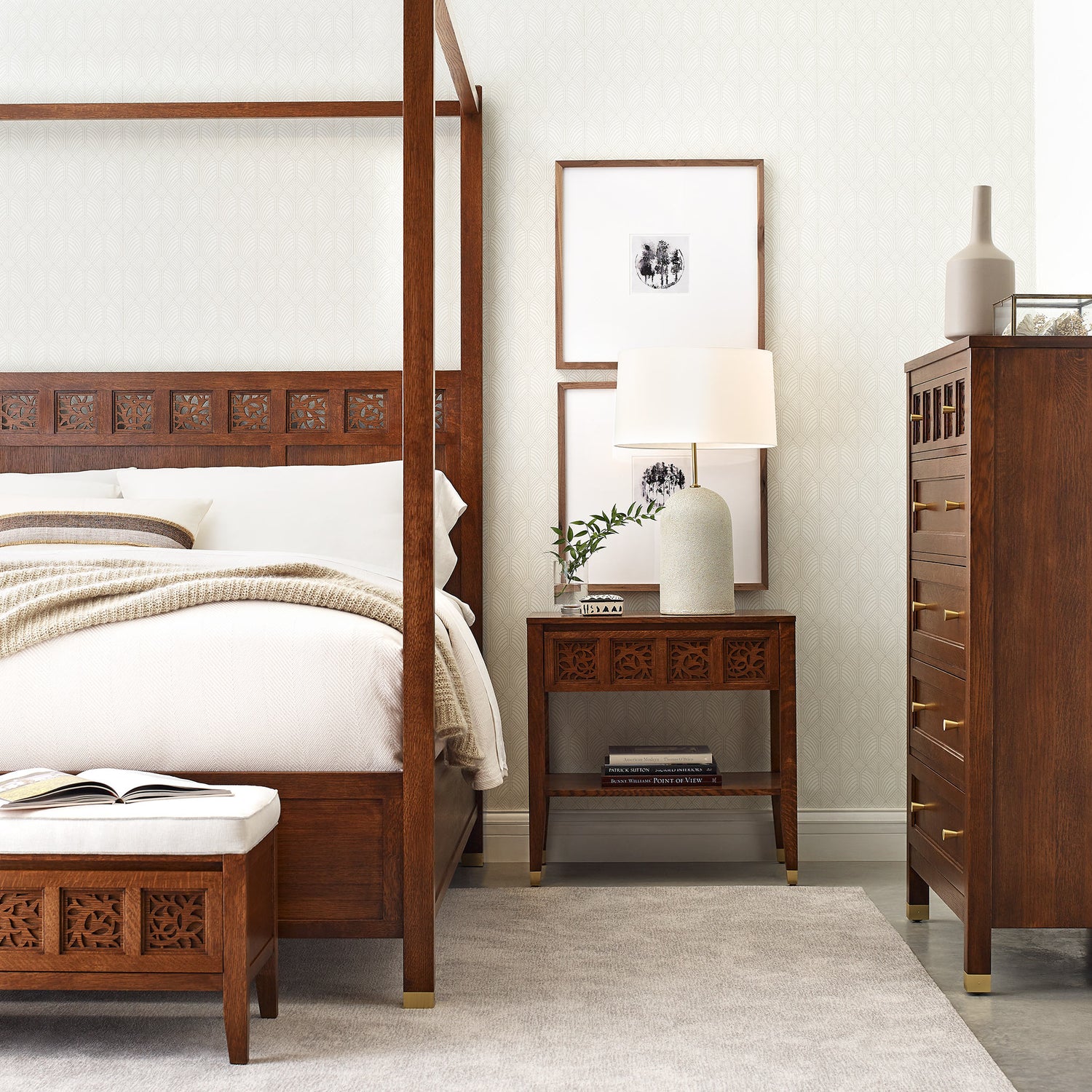 The white oak Open Nightstand brings a lighter look to the Surrey Hills bedroom thanks to its open shelf and long legs that taper to the floor. A single side-hung, center-guided drawer with finger pull is faced with our stepped fretwork and its sinuous laser-cut vines.