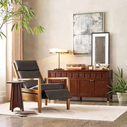 The back of the Surrey Hills Recliner is a gently curved trellis grid that's too beautiful to hide against a wall. Crafted of American white oak, the chair's arms and legs have an attractive swell and taper, cradling finely tailored cushions. A footrest is tucked up beneath the wide, roomy seat in the upright position; pushing back raises the footrest before continuing to a full recline. Available in three semi-aniline Morganton leathers for Express Ship.