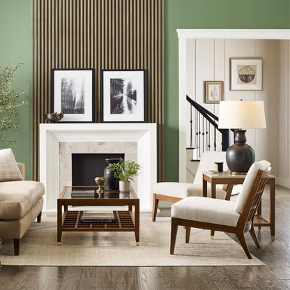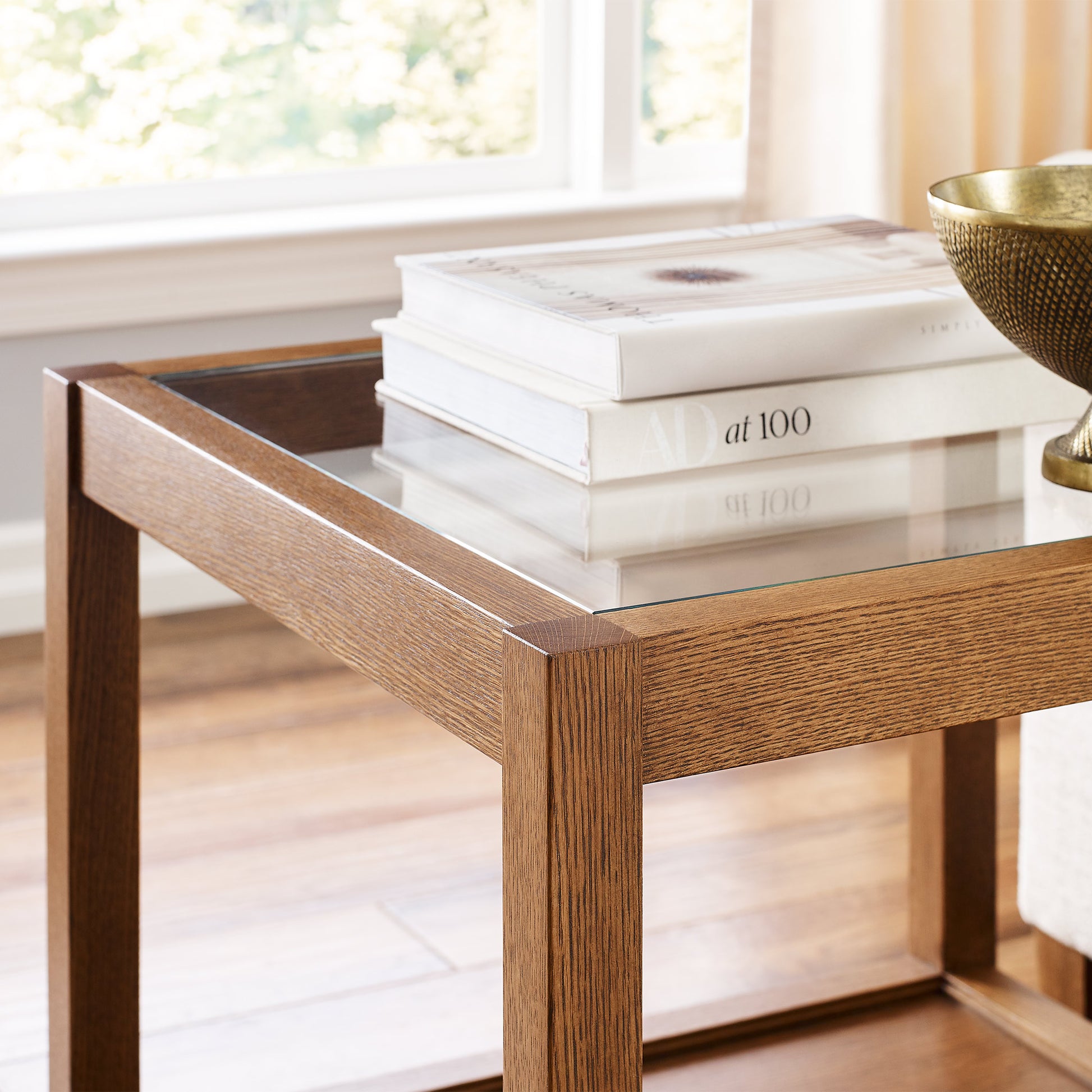 Crafted of quartersawn white oak, the square Surrey Hills Side Table includes a full lower shelf with a stepped frame inspired by the collection's trellis motif. Its tapered legs end in low satin brass ferrules. An optional stone top in sea grass hues brings a hint of nature's beauty.