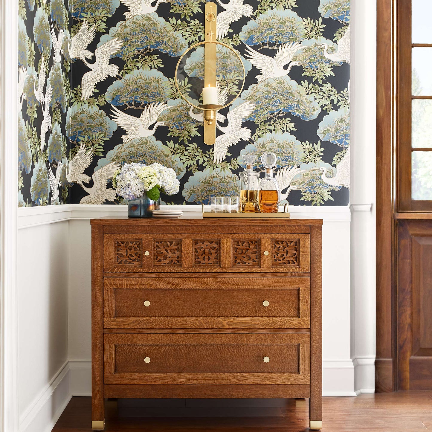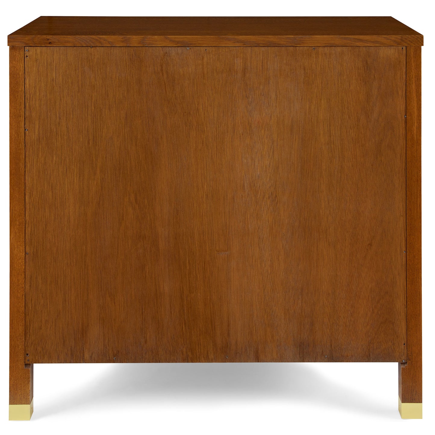 The Three-Drawer Chest is a flexible piece, equally at home in the bedroom or in an entry or hallway greeting visitors. A case of quartersawn white oak holds three side-hung, center-guided drawers with tapered satin brass knobs in two sizes. The top drawer features our fretwork motif with a back panel and a continuous vine pattern cut from square to square. Stepped stiles around each square and drawer face add definition and depth, and the legs end in low satin brass ferrules.