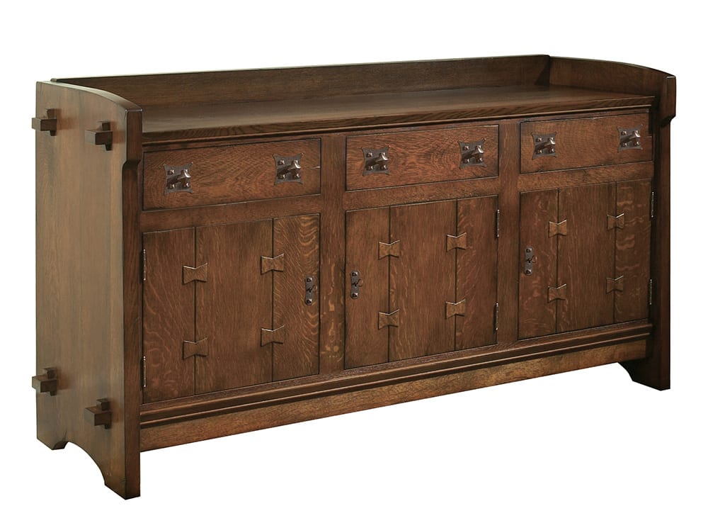 One of Gustav Stickley's earliest designs, this piece features massive slab ends with through keyed tenons and raised butterfly joinery as well as plenty of storage space. One adjustable shelf behind each of the doors and a secret compartment for treasured keepsakes. Available in solid oak.