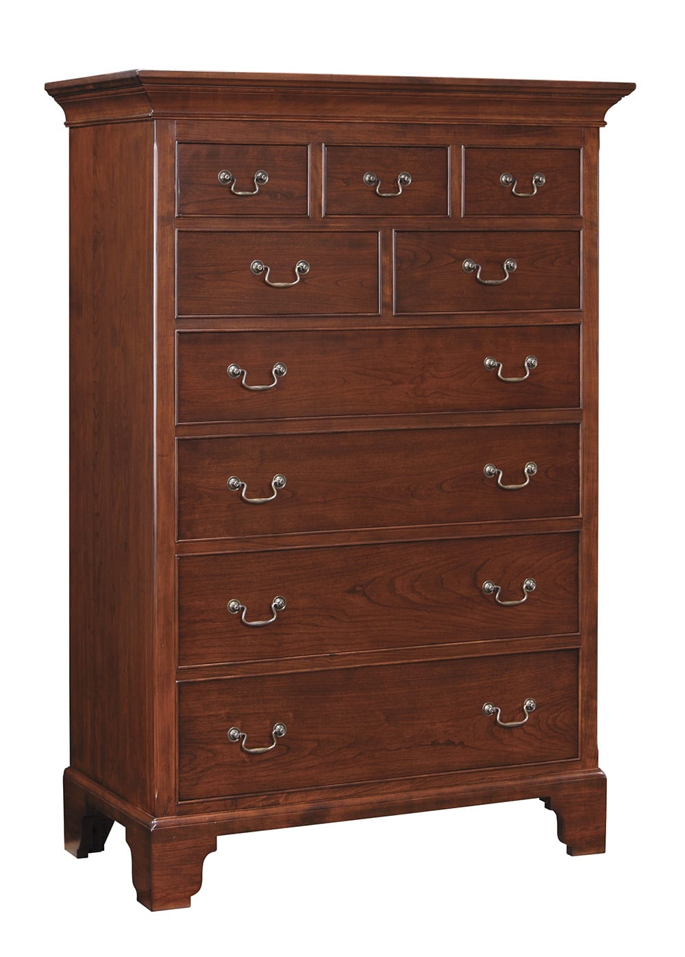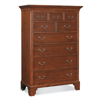 The Wayside Inn Tall Chest consists of nine beaded drawers with swan neck bail pulls. Chamfered posts, bracket feet and moulded top enhance this enduring design. Solid cherry in a Wayside Cherry finish that has light physical distressing and cow-tailing antiquing.