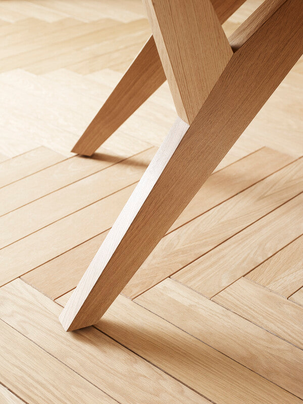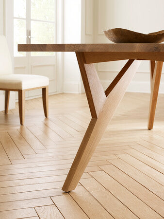 Beneath a fixed solid-wood top, the Yarrow Dining Table's center-angled, Y-shaped legs create a dynamic modern silhouette that alters with your viewpoint. Solid white oak, with its linear grain, gives the piece a natural, casual look with the versatility to complement any style of room.