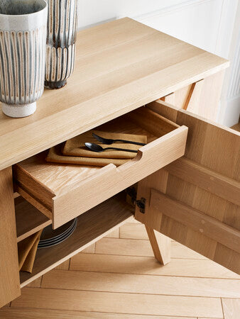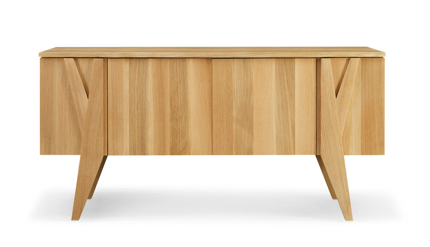 For the Yarrow Sideboard, an upright translation of the table's Y-leg is integrated into to the case from floor to top, making it a gorgeous companion piece. Two vertically grained panel doors reveal a pair of drawers and one fixed shelf that provide ample storage. Solid oak and veneers give the sideboard its casual beauty.